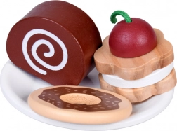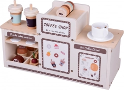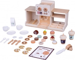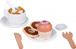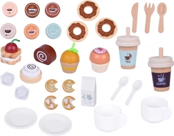 Les nombreux accessoires incluent des tasses avec soucoupes et cuillères, des gobelets à emporter avec couvercles (Tea, Coffee), une brique de lait, des couverts, divers gâteaux, muffins, biscuits et chocolats, ainsi qu’un menu simple. Tout est parfaitement adapté aux petites mains et favorise la motricité fine, la coordination œil-main et les compétences sociales.