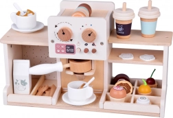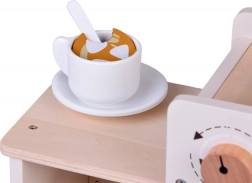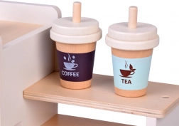Les boutons rotatifs, les icônes imprimées et le porte-filtre donnent l’impression d’une véritable préparation du café. Les enfants peuvent insérer des capsules en bois et « régler » la boisson idéale.