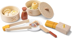 Ce set de dim sum en bois apporte dans la chambre d’enfant l’ambiance authentique de la cuisine asiatique. Les enfants peuvent « cuire à la vapeur » des raviolis dans les paniers empilables, les servir dans une assiette et les assaisonner de « sauce soja ». Les baguettes et le couteau aident à entraîner la prise, la coordination et la dextérité.