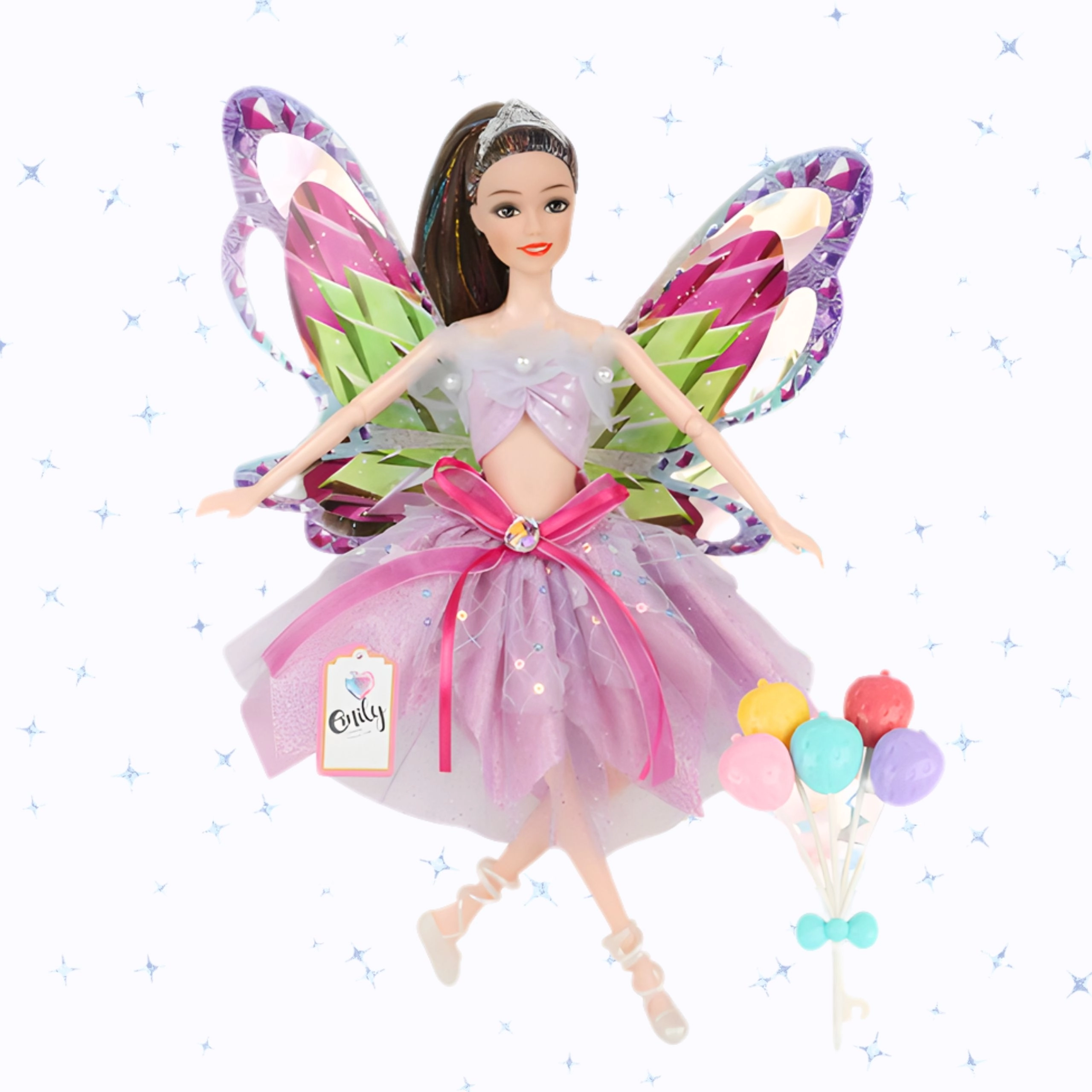 - poupée Emi en costume de fée, 2 barrettes, set de ballons colorés