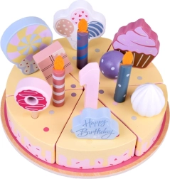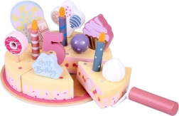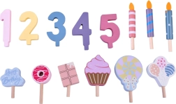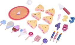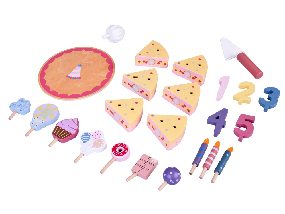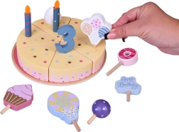 Organisez votre propre fête d’anniversaire ! Le gâteau en bois se compose de 6 parts qui peuvent être « coupées » puis réunies, et décorées avec des bougies, chiffres et friandises interchangeables. Le set est idéal pour jouer ensemble, apprendre les couleurs, compter et s’exercer au service poli.