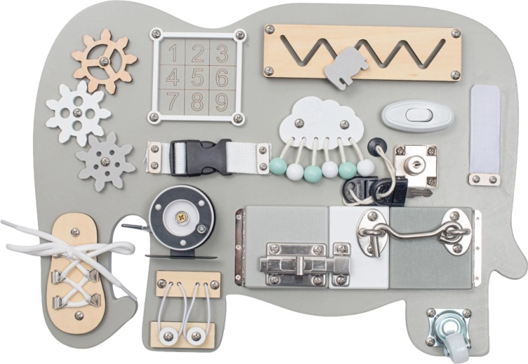 Cette planche d’activités Montessori éducative apporte aux enfants des stimuli concrets de la vie quotidienne et les motive à explorer de manière autonome. Le design élégant en forme d’éléphant s’intègre parfaitement à tout intérieur et, grâce au bois robuste, résiste même à une utilisation intensive.