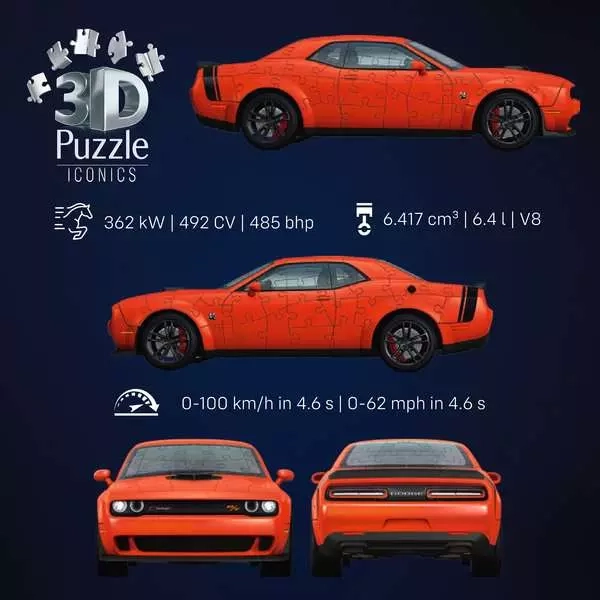 Ce modèle de puzzle 3D de la collection Iconics reproduit fidèlement l’allure emblématique de la DODGE CHALLENGER R/T SCAT PACK WIDEBODY. Grâce aux pièces précisément moulées et numérotées, l’assemblage est intuitif et ne nécessite aucune colle – les éléments s’emboîtent solidement.