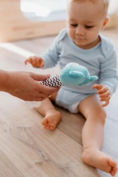 En appuyant, le jouet émet un son sifflant apaisant qui attire naturellement l’attention de bébé et soutient le développement de la perception auditive.