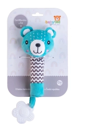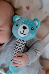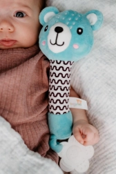 Grâce aux motifs contrastés sur le corps de l’ourson, le jouet soutient la perception visuelle et la concentration. La sécurité est assurée par une fabrication soignée, une certification en RC et des matériaux doux pour la peau des enfants.