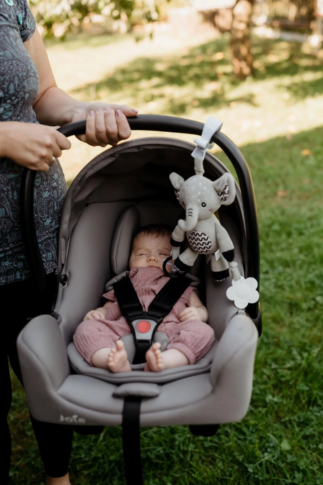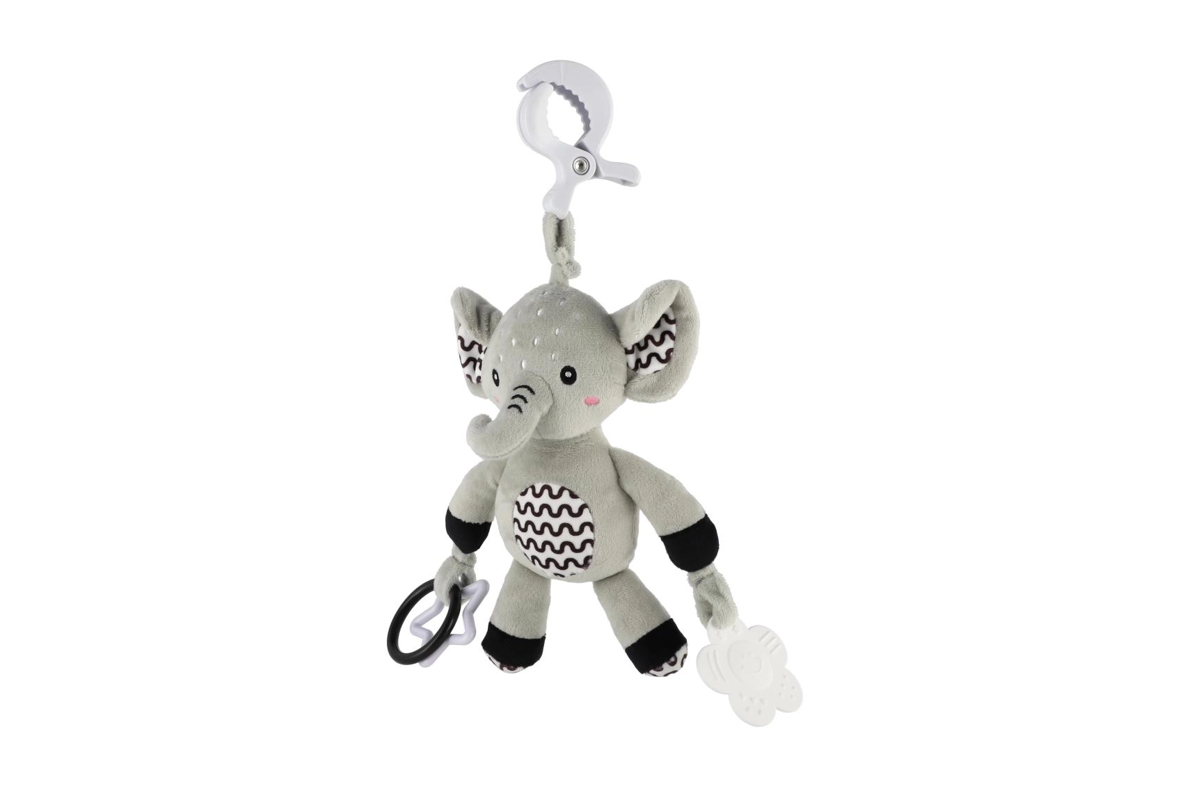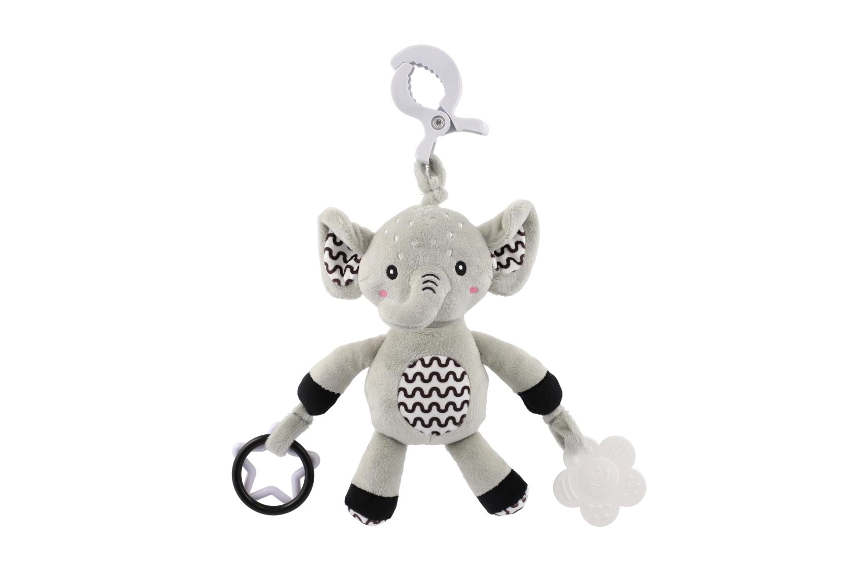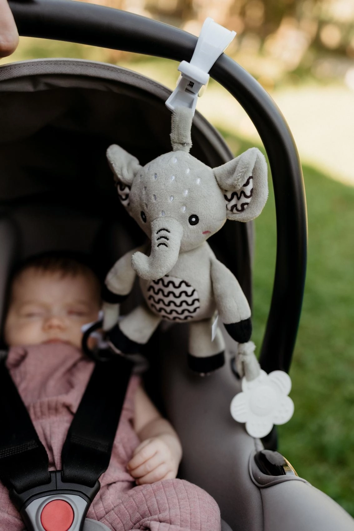 En un instant, fixez l’éléphanteau à la poussette, au lit bébé ou à l’anse du siège auto – un divertissement idéal en voyage comme à la maison.