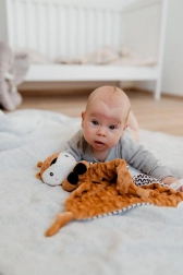 L’anneau souple placé dans un coin du doudou aide à soulager l’éruption dentaire et offre une mastication sûre à tout moment de la journée.