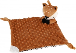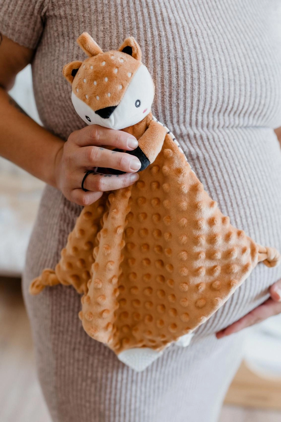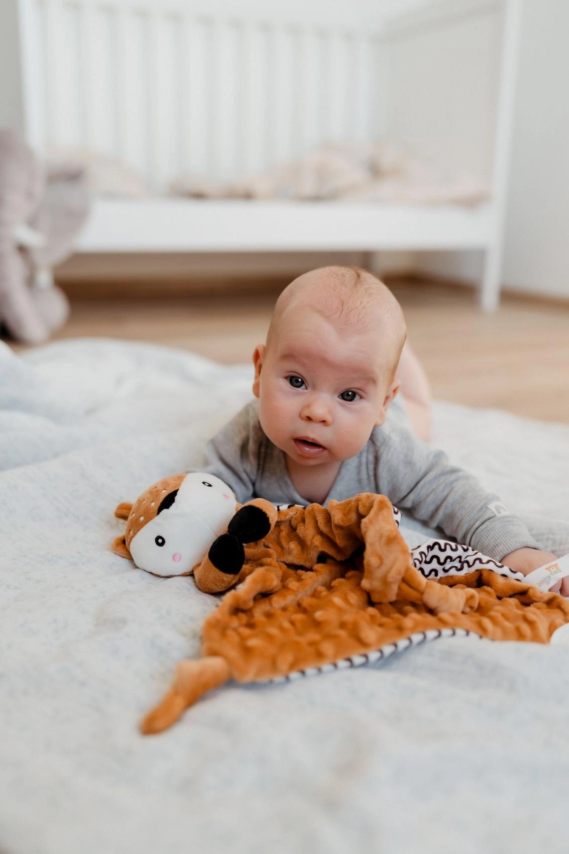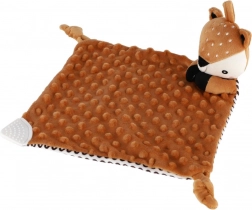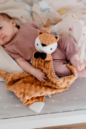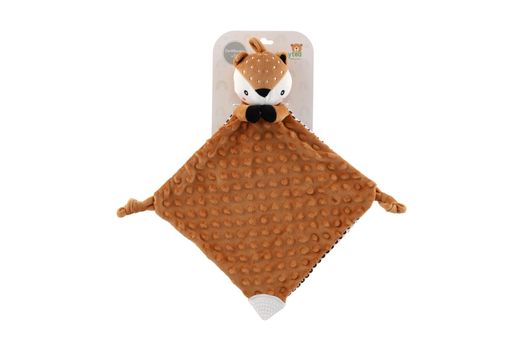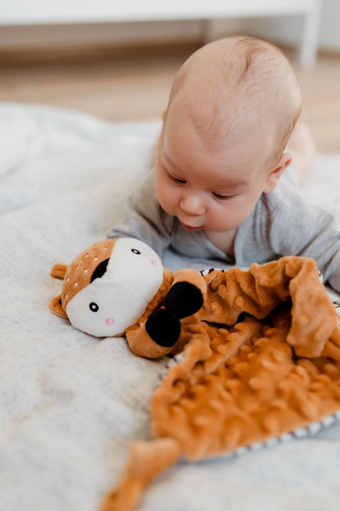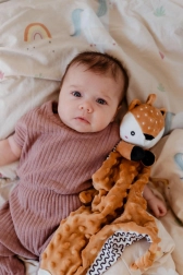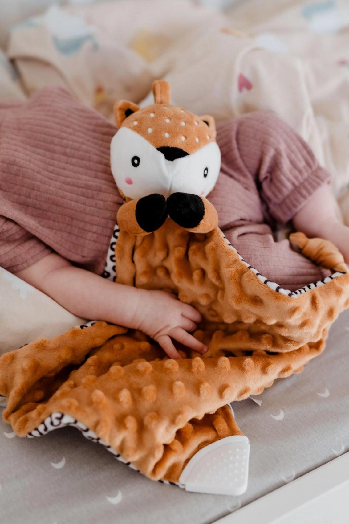 Ce doudou tout doux avec petit faon combine une couverture câline et un compagnon en peluche. Le tissu minky texturé avec pois en relief offre une riche stimulation tactile et de tendres moments de câlin. L’anneau de dentition intégré aide lors de la poussée dentaire et le hochet délicat favorise la perception des sons et la coordination.