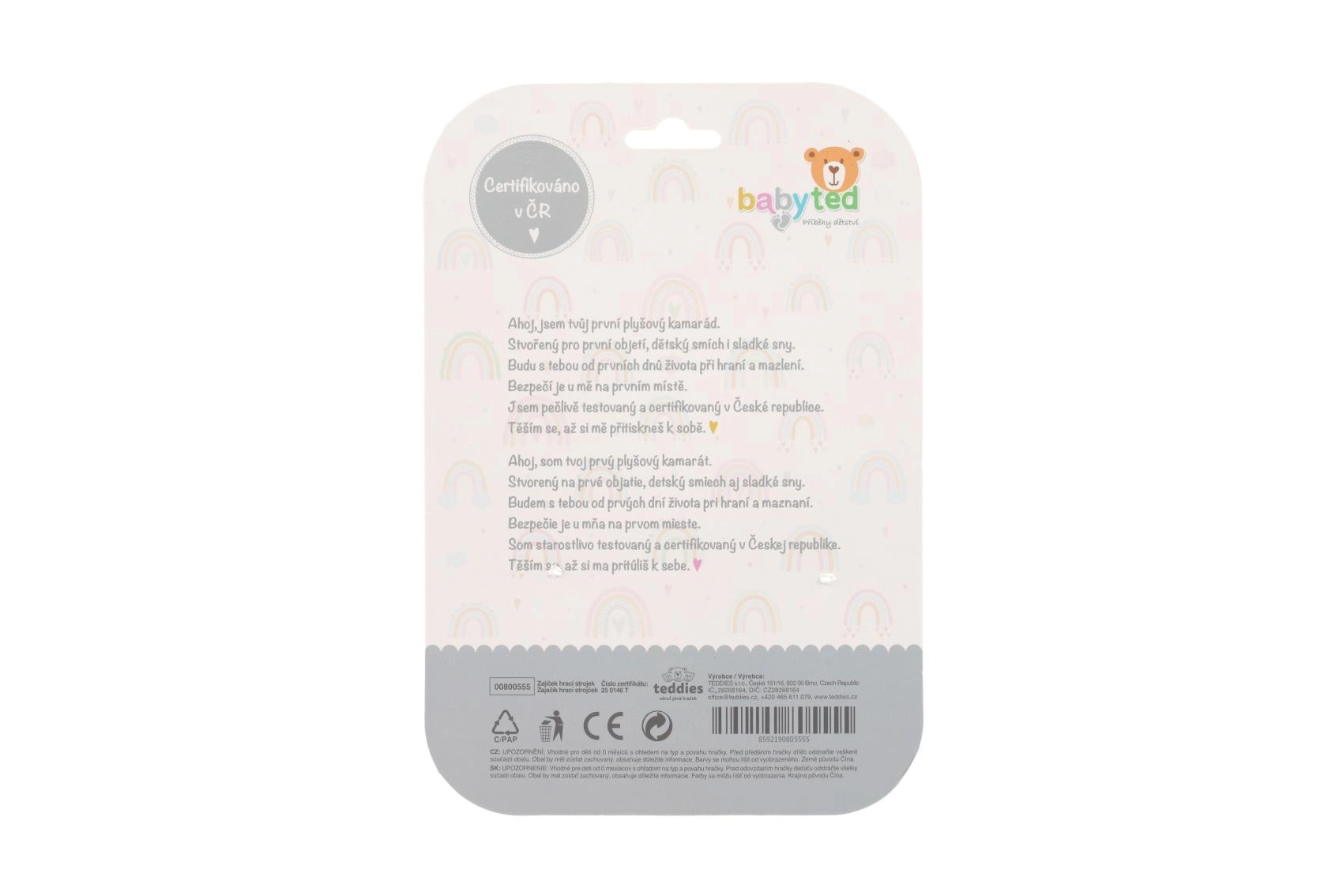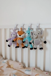 La peluche ultra-douce invite aux câlins, tandis que les détails contrastés et les oreilles au léger bruissement favorisent le développement de la vision et de la motricité fine. Une fabrication de qualité et une certification en République tchèque garantissent une utilisation sûre dès la naissance.