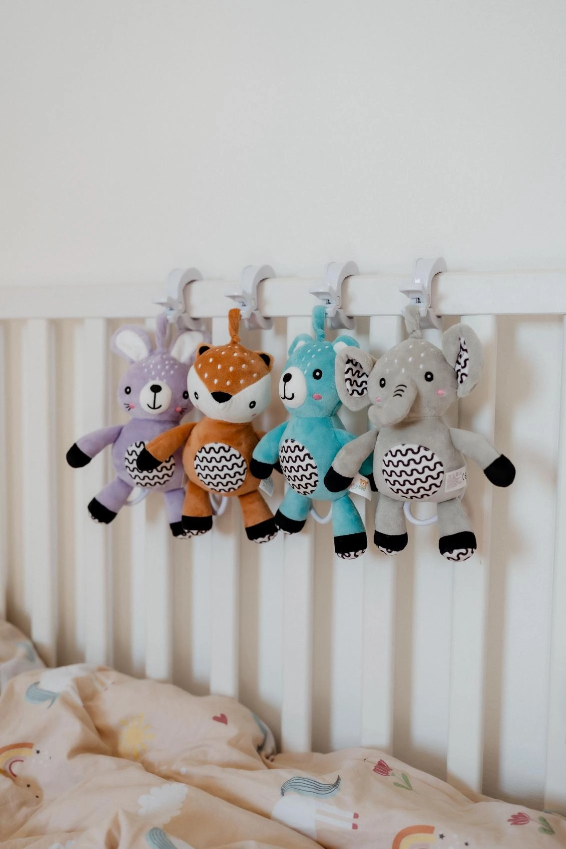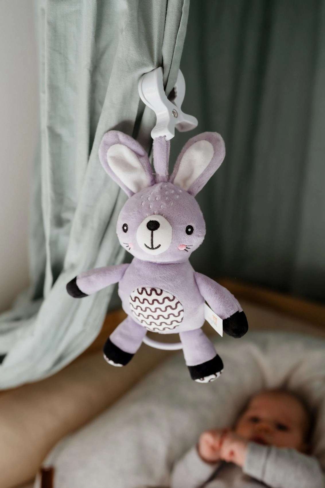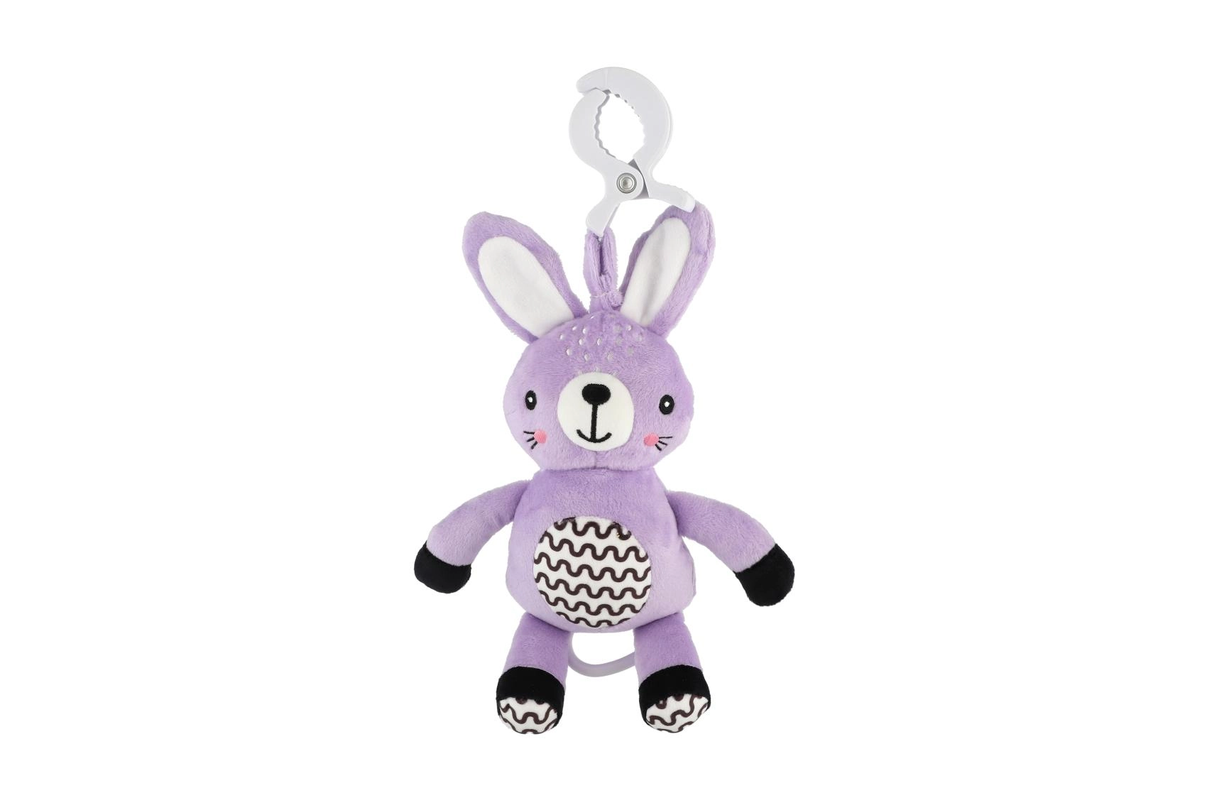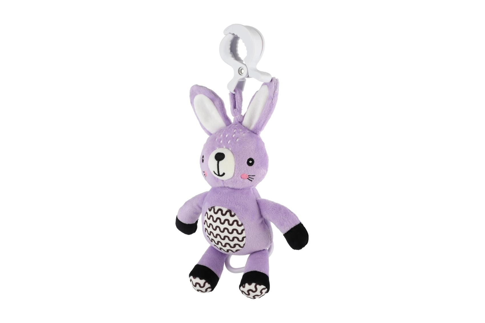Le clip pratique permet de fixer rapidement le lapin à la poussette, au lit, au siège auto ou à une arche d’éveil – toujours à portée de main à la maison comme en déplacement.