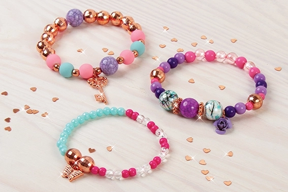 Avec 90 perles, 3 breloques et un élastique, conçois facilement des bracelets uniques pour chaque occasion.