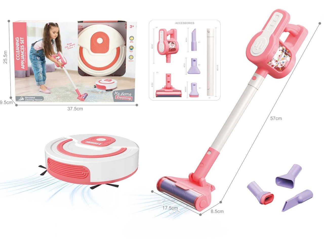 Un set de nettoyage pour enfants amusant et réaliste avec aspirateur balai et aspirateur robot ravira les petits aides dès 3 ans. Il offre des billes colorées tourbillonnantes dans une chambre transparente, des embouts interchangeables et un robot avec effet d’aspiration et brosses rotatives. Fabriqué à partir de matériaux sûrs, il encourage la créativité, la motricité fine et l’habitude de l’ordre.