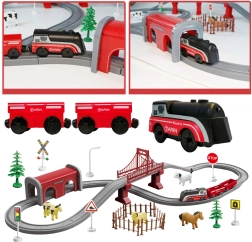 - Locomotive électrique, 2 wagons de fret avec attelages magnétiques, 20 pièces de rails, 13 connecteurs, 2 supports de pont, 3 éléments de pont, 5 éléments de tunnel, 5 panneaux routiers, 1 lampadaire, 6 socles, 2 arbres, figurines de cheval, chien, bélier et vache, 5 clôtures, autocollants, notice avec propositions de circuits