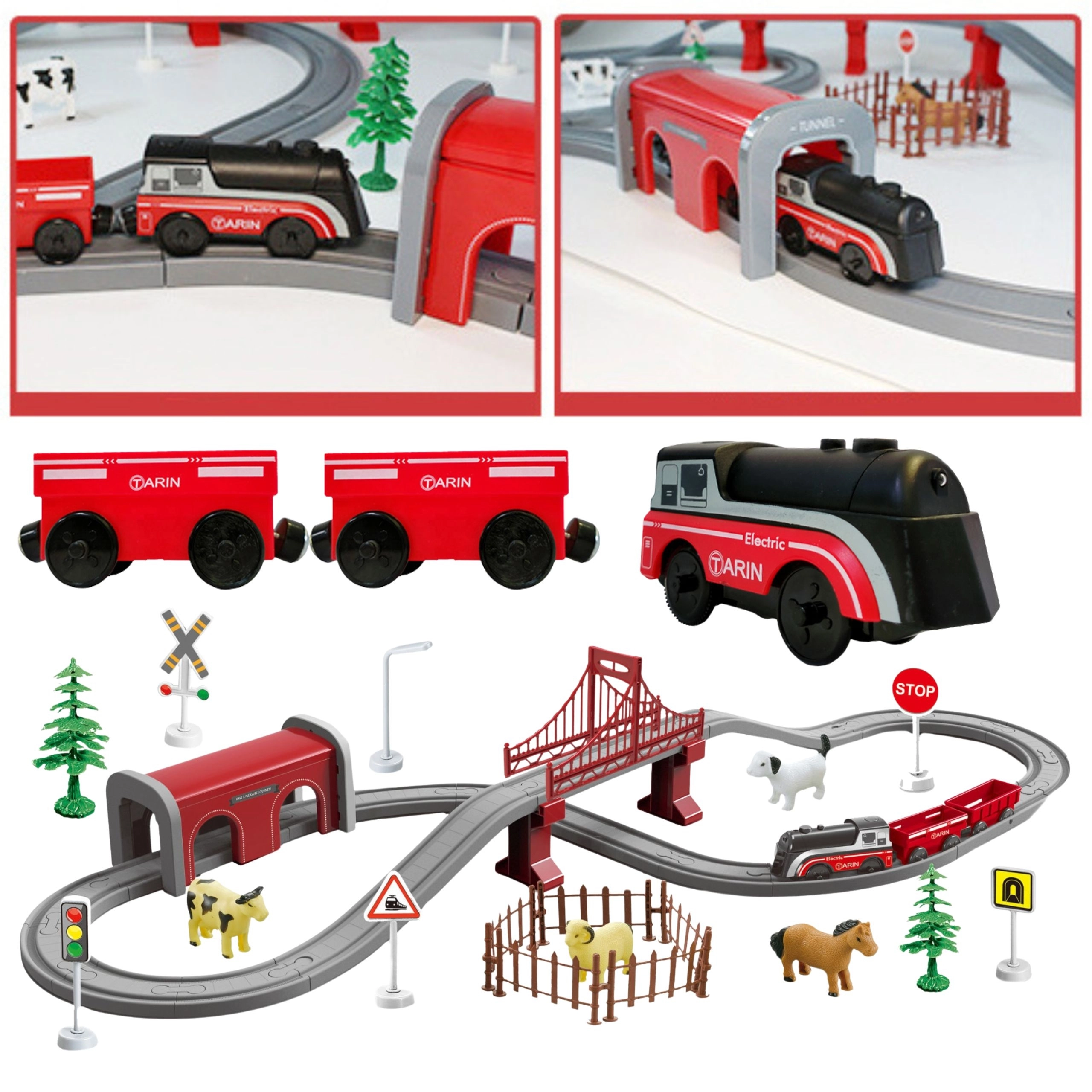 - Accessoires riches : pont, tunnel, panneaux, arbres, clôtures et animaux pour créer son propre univers.