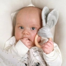 L’anneau de dentition en bois avec de petites « oreilles » en tissu se tient facilement même par les plus petites mains, aide lors des poussées dentaires et soutient la coordination œil–main.
