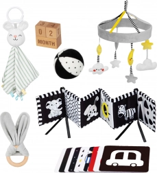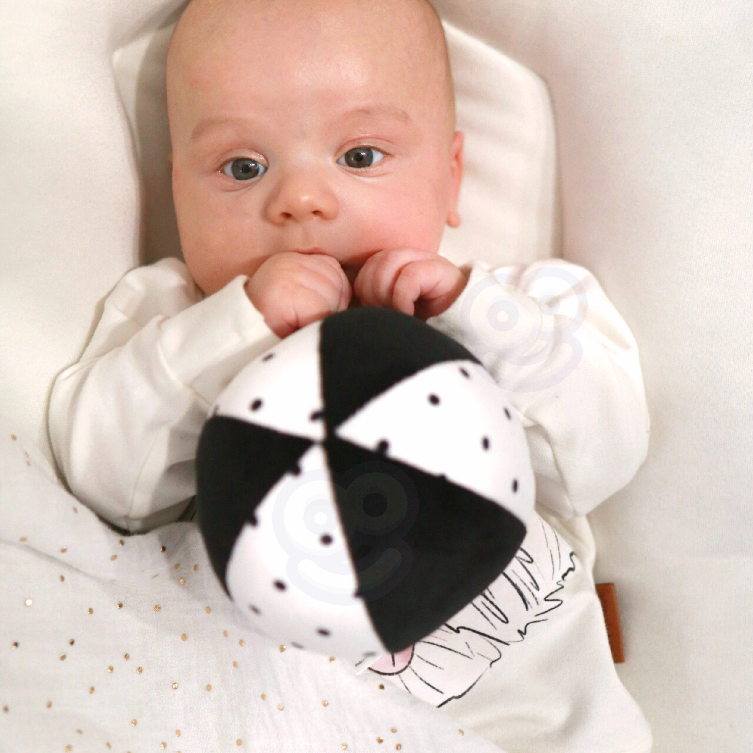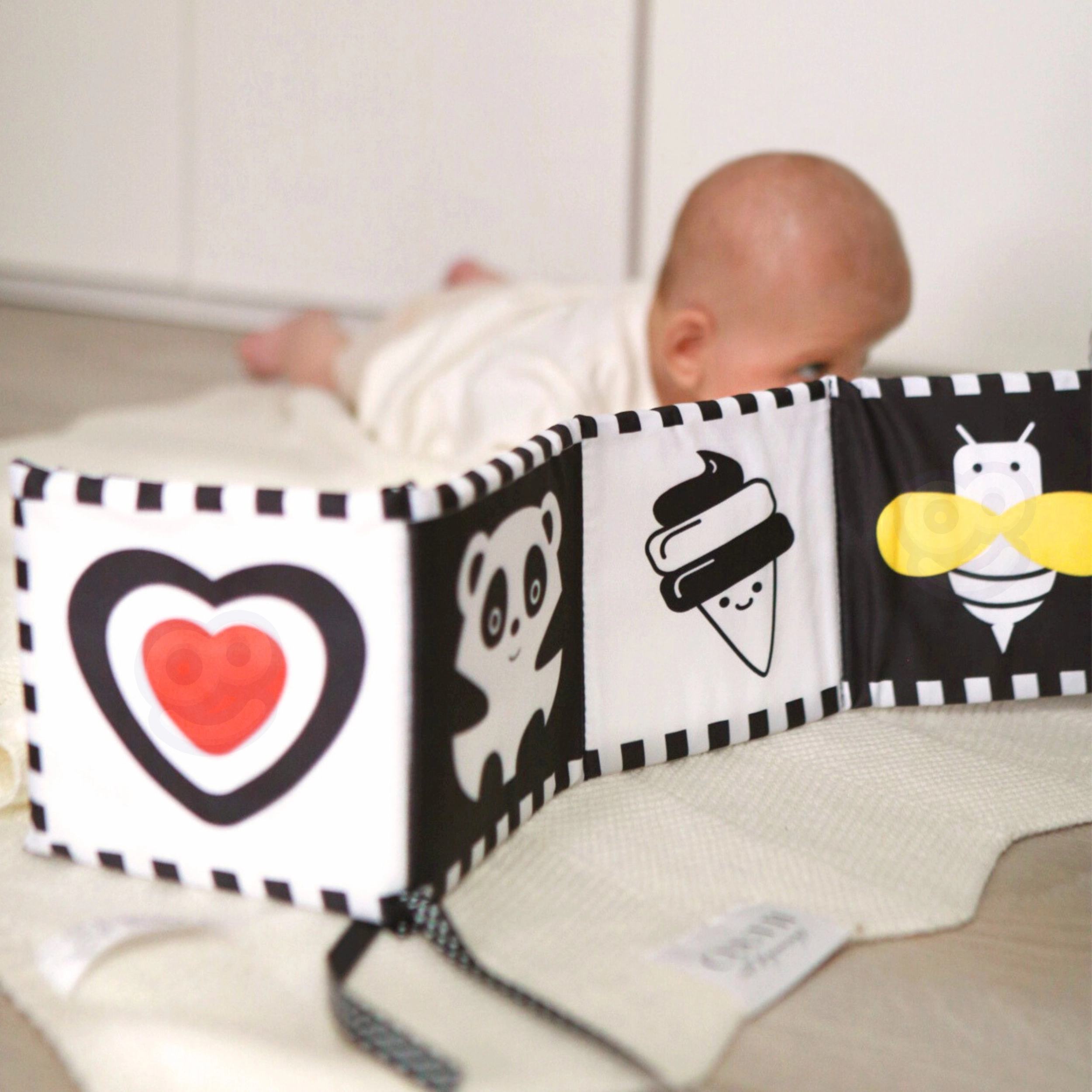 Les motifs noir et blanc sur les cartes, le petit livre et le panneau attirent naturellement le regard du nouveau-né, favorisent les premiers focus et prolongent le temps de concentration pendant le tummy time.