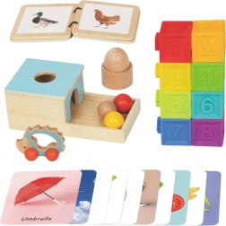 - Œuf en bois et gobelet ; boîte en bois de permanence de l’objet avec 3 balles ; 10 cartes illustrées (20 motifs) ; 8 cubes sensoriels souples avec chiffres, formes et animaux ; livre en bois avec animaux ; jouet hochet en bois – voiture hérisson ; guide imprimé pour les parents