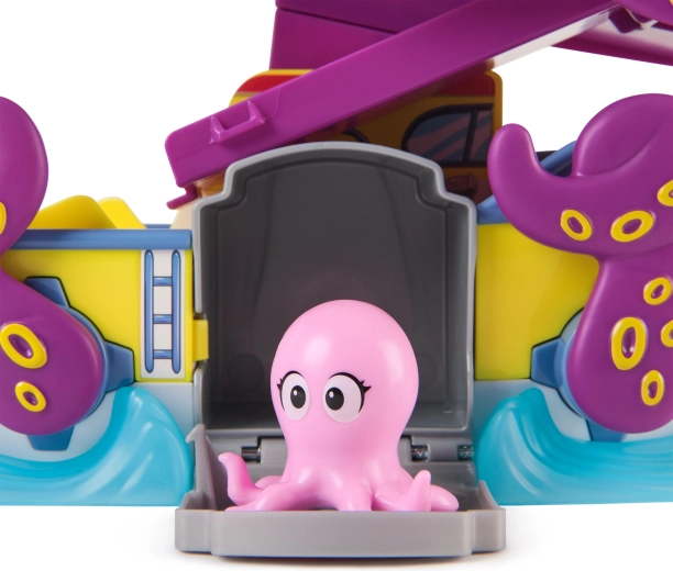 Ce coffret de jeu coloré transporte les enfants directement à bord d’un bateau, où le poulpe, grâce à ses tentacules mobiles, crée des obstacles et ouvre la voie vers un sauvetage audacieux. En appuyant sur le bouton, la rampe et le piège se déclenchent, Chase s’élance sur la piste et vise le radeau de sauvetage pour ramener le petit poulpe à sa maman.