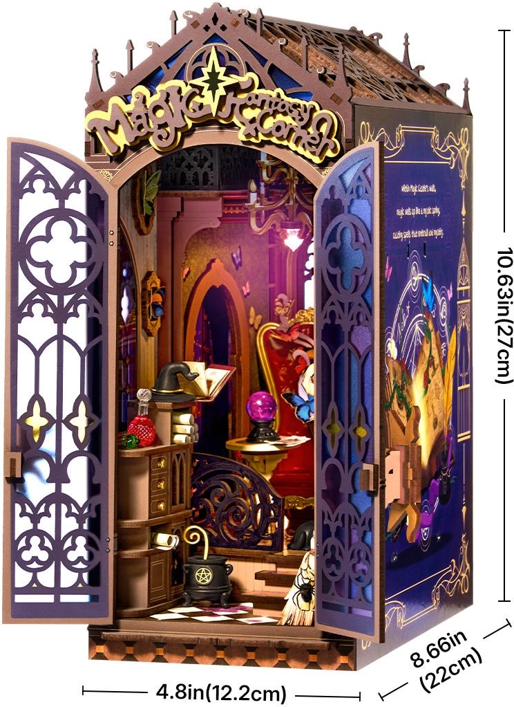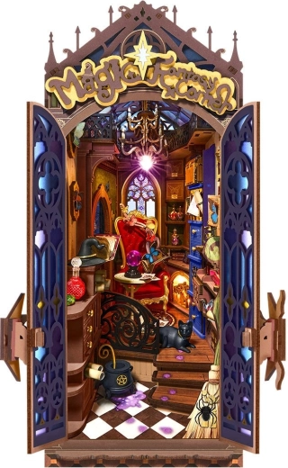 Le kit est fabriqué avec des matériaux de qualité, sûrs et non toxiques. Grâce à sa conception bien pensée, le modèle convient comme serre-livres ou comme décoration autonome sur une étagère. L’éclairage LED crée le soir une ambiance chaleureuse et mystérieuse et met en valeur chaque détail miniature.