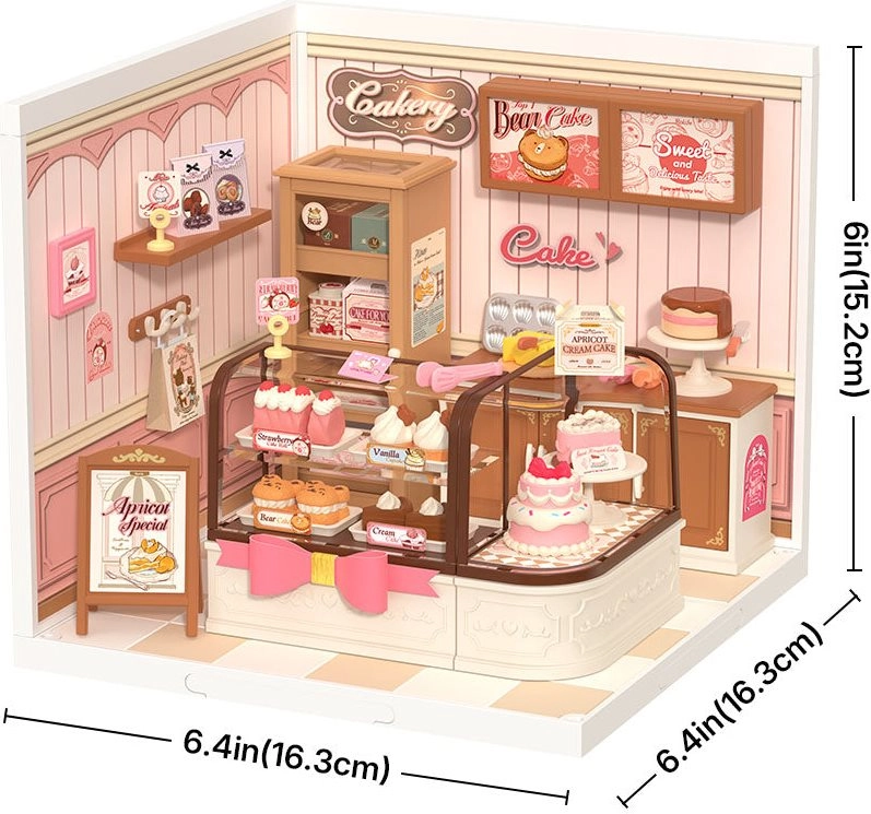Découvrez le charme d’une pâtisserie miniature où ne manquent ni gâteaux, ni roulés, ni desserts en couches, tous plus appétissants les uns que les autres. Au centre, des vitrines en verre et deux comptoirs — l’un droit et l’autre élégamment courbé — exposent cupcakes et macarons avec étiquettes colorées. Des pinces de service et d’autres gourmandises rangées à l’arrière renforcent l’authenticité du lieu.