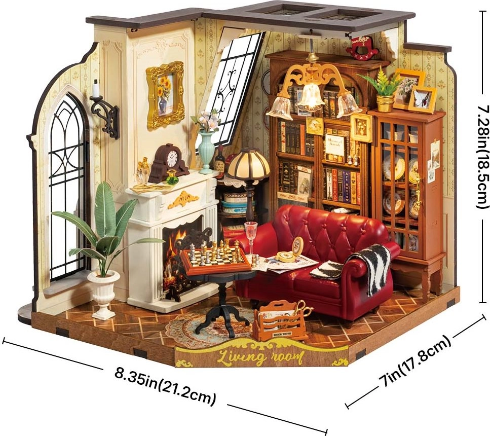 Construisez un mini-salon élégant aux riches tonalités bois, sol en mosaïque et lumière chaude. Ce modèle 3D en bois allie un beau design et des détails soignés – de la porcelaine délicate au lampadaire, jusqu’à l’échiquier et aux étagères remplies de livres. Idéal comme décoration, cadeau et projet créatif relaxant.