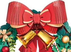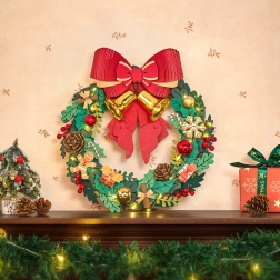 Cette élégante couronne de Noël combine des motifs traditionnels et le plaisir moderne du DIY. Les rameaux verts sont complétés par des ornements tels que le houx, les baies, les pommes de pin, les flocons de neige, le bonhomme en pain d’épices, les cadeaux et l’iconique grand nœud rouge avec clochettes dorées. Les LED intégrées renforcent l’ambiance festive et transforment le modèle terminé en une décoration unique pour porte ou mur.