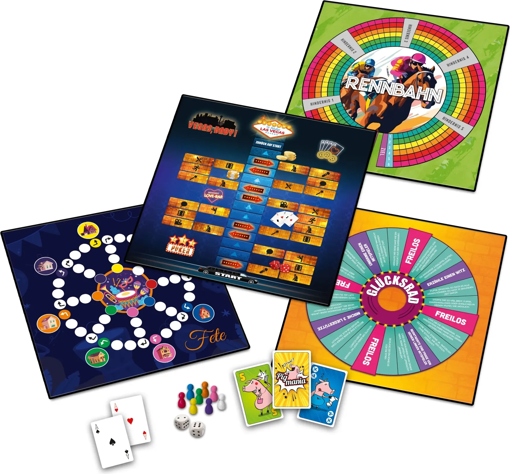Partymania est un set polyvalent qui allie variété, règles simples et préparation rapide. Grâce à deux plateaux de jeu recto-verso, des dizaines de cartes et des composants en bois, choisissez un jeu pour chaque occasion – des défis de mots rapides aux activités en équipe.