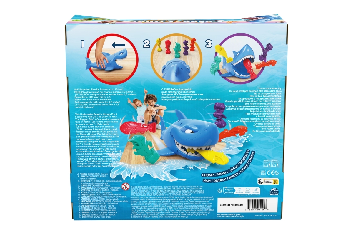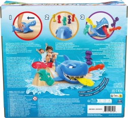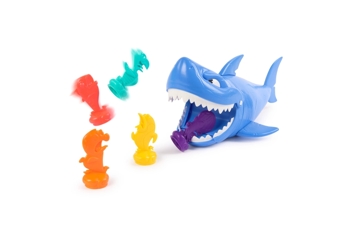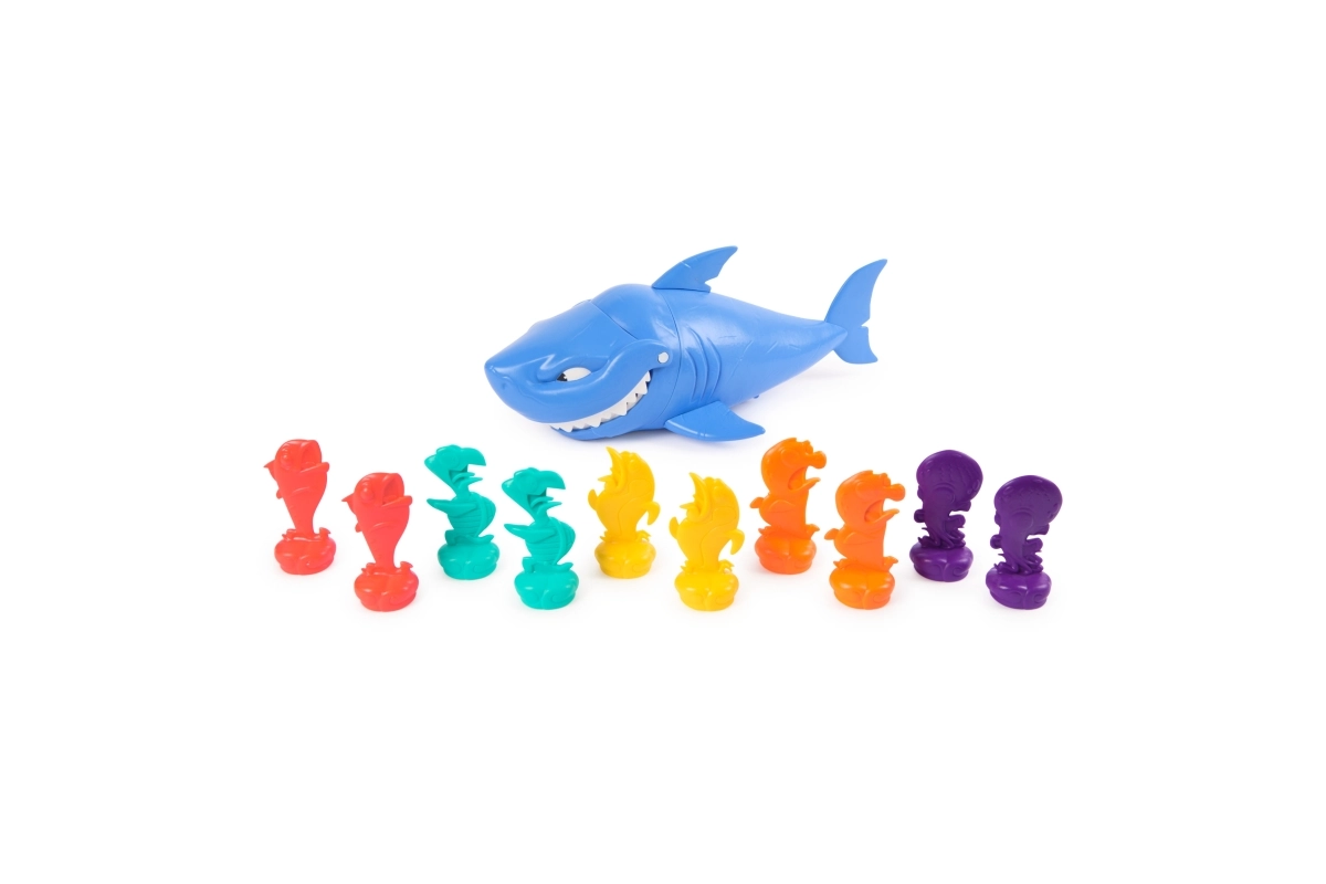Lance le requin, vise les poissons de l’adversaire et amuse-toi comme jamais ! Les joueurs placent leurs figurines colorées au sol, le plus jeune commence, remonte le requin et le met en action. L’objectif est, en trois tentatives, de prendre le plus de poissons possible à l’adversaire – celui qui en attrape le plus gagne.