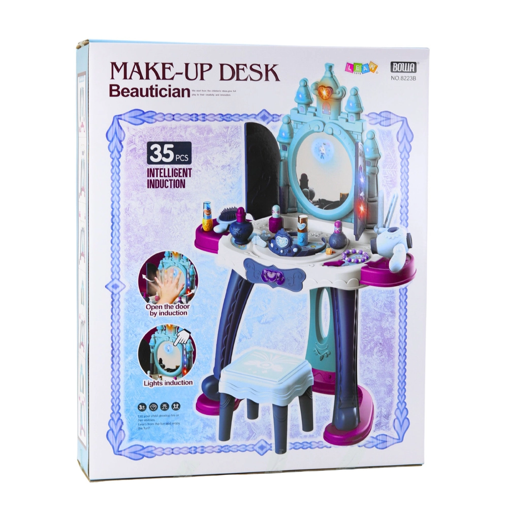 La coiffeuse interactive Princesse des Glaces apporte aux enfants l’atmosphère d’un véritable boudoir royal. À l’approche, les portes s’ouvrent et révèlent un miroir sur lequel apparaissent des personnages de princesses. Des LED placées en haut, sur les côtés du miroir et sur les portes créent un éclairage doux, tandis que des mélodies magiques stimulent l’imagination et invitent au jeu.