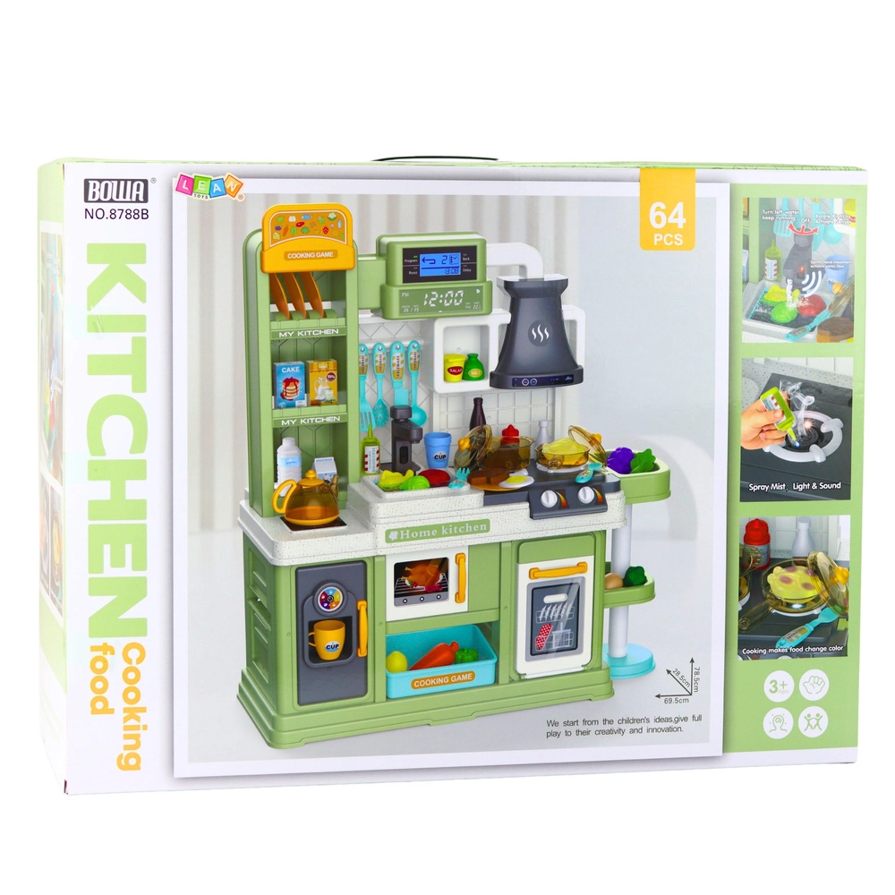 Un large plan de travail, des plateaux latéraux, un four et un réfrigérateur ouvrants, des étagères et des compartiments apprennent aux enfants l’ordre et la logique. Sont inclus des casseroles, poêles, vaisselle, petites bouteilles et faux aliments, pour composer un « menu » selon leur imagination. Le tout est fabriqué en plastique sûr et résistant aux bords lisses pour un jeu quotidien confortable.