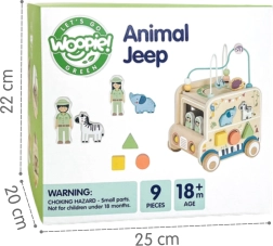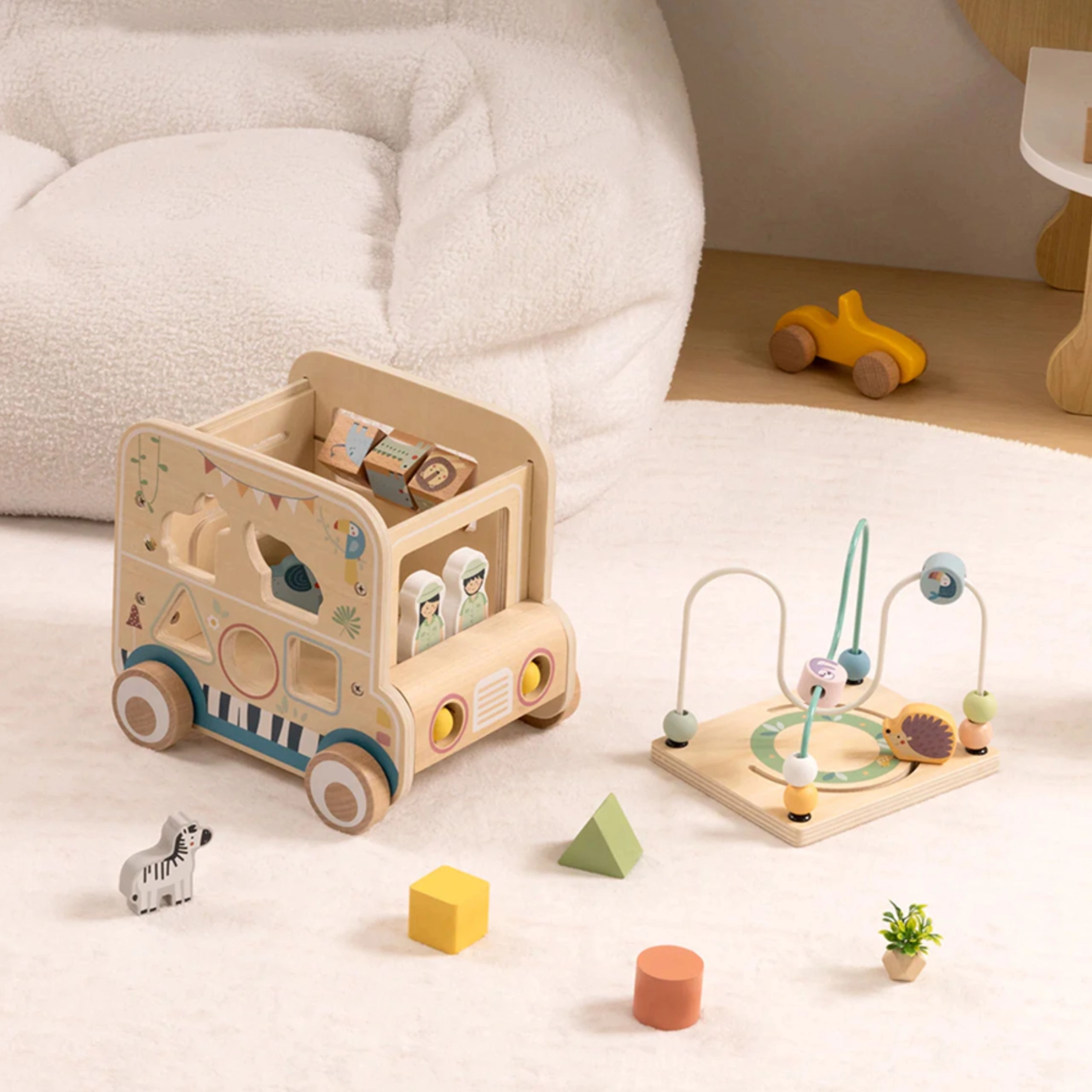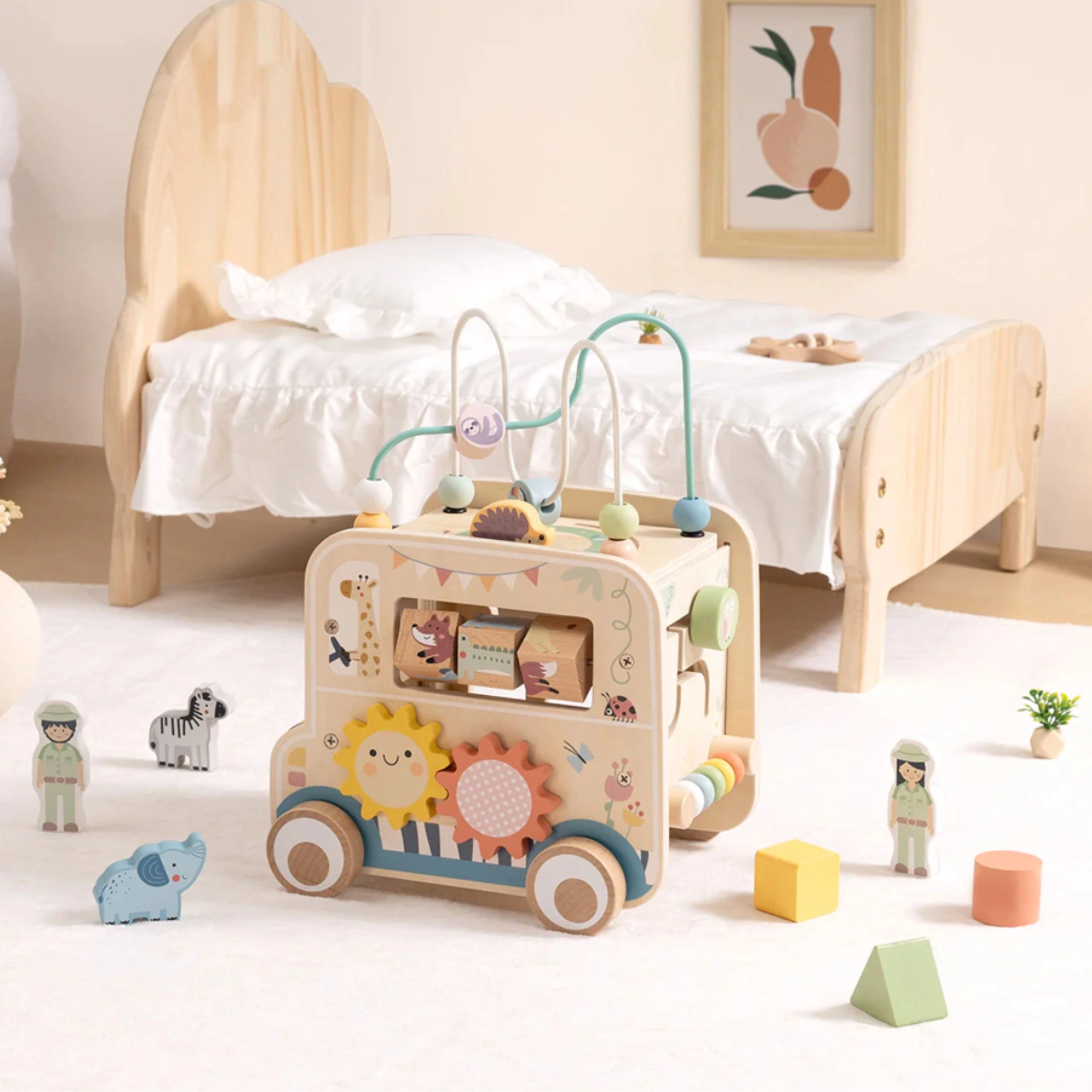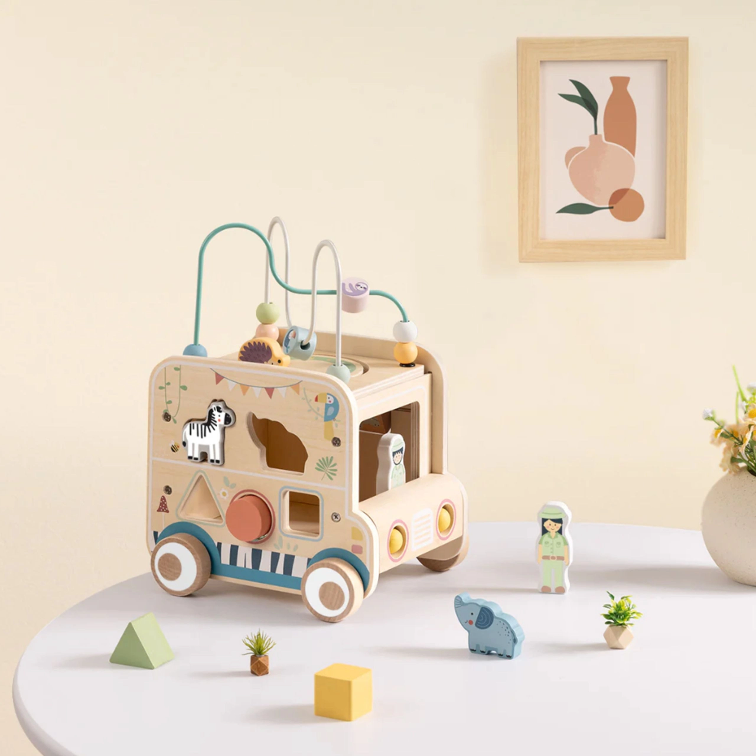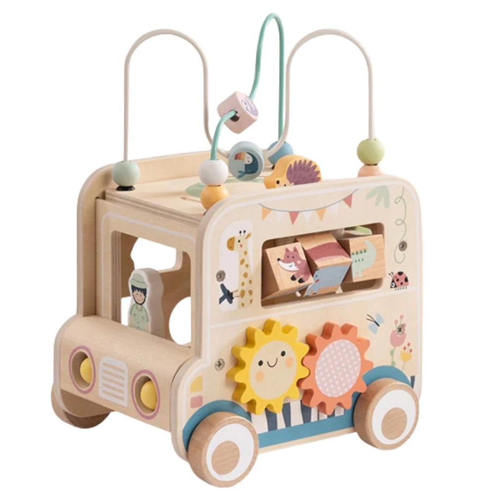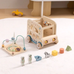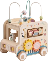 Le cube d’activités/voiture safari en bois offre aux enfants d’innombrables possibilités de découverte. De l’arceau moteur amovible avec perles, au labyrinthe et aux roues dentées, jusqu’aux blocs rotatifs avec animaux – chaque face propose un nouveau défi. Le design aux couleurs douces et la finition lisse garantissent un jeu sûr et un bon développement des compétences.