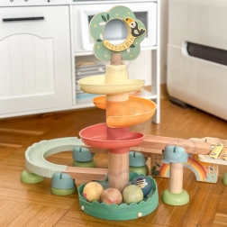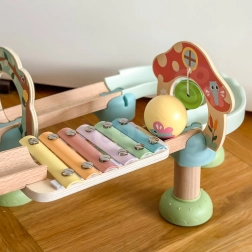 Cette piste à billes de qualité combine mouvement, son et exploration curieuse. Les enfants regardent les billes rouler le long des courbes, franchir les ponts et déclencher la section musicale avec xylophone, ce qui développe le sens du rythme, la concentration et le plaisir de jouer. Les doux tons pastel aux motifs de nature créent une atmosphère apaisante et s’intègrent parfaitement à toute chambre d’enfant.
