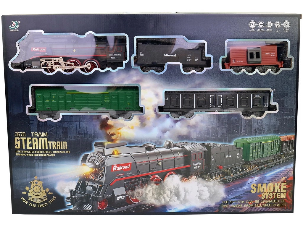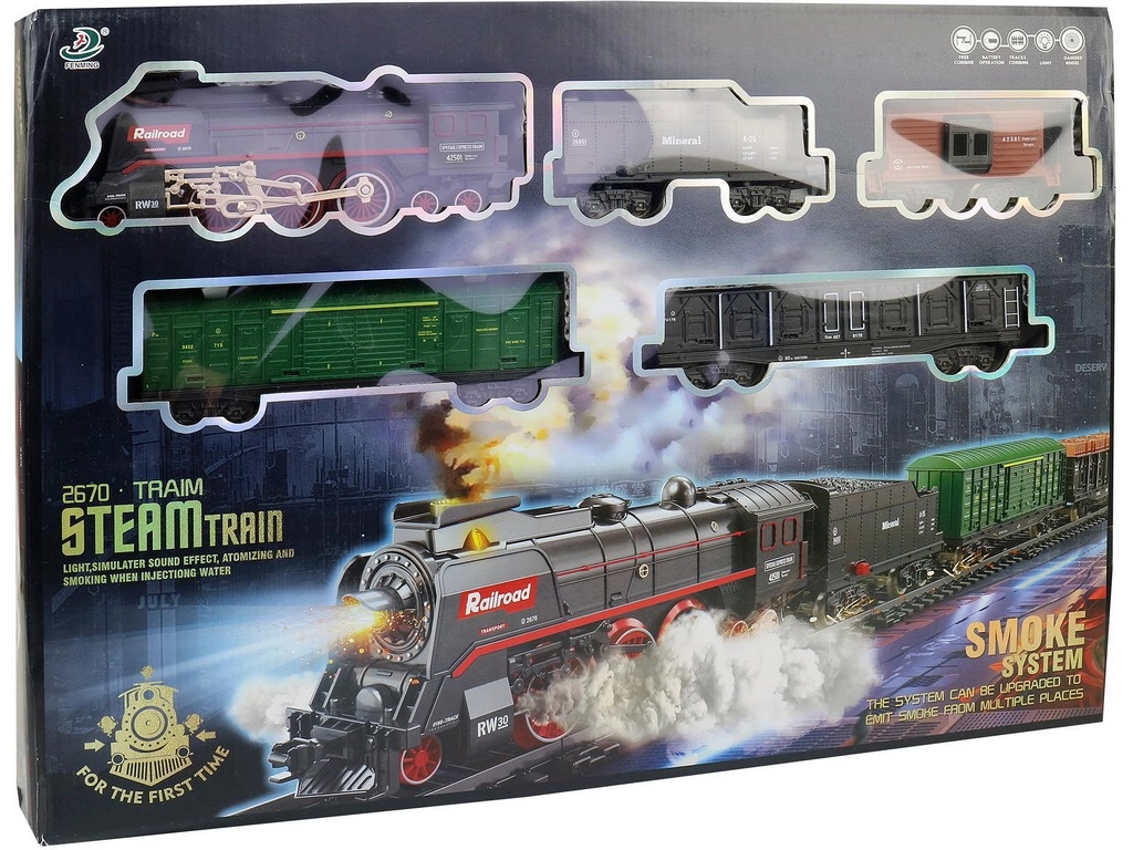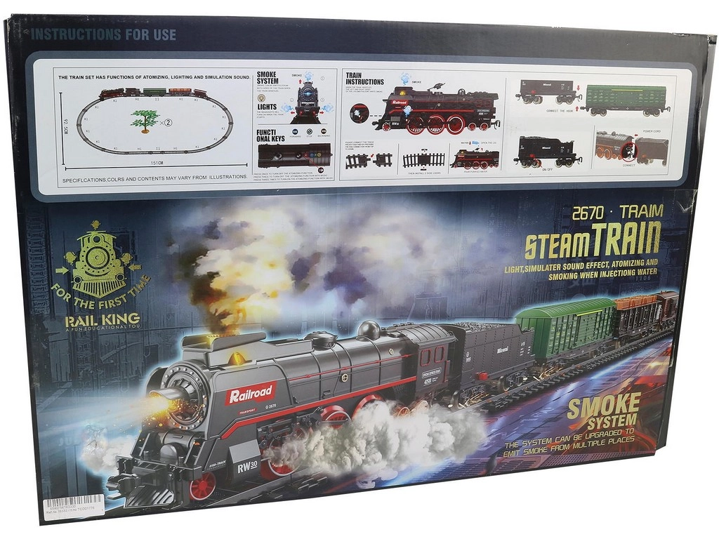Faites plaisir aux enfants avec un train à vapeur réaliste à piles, offrant un effet de vraie vapeur depuis la cheminée et le châssis, des effets lumineux et sonores, une voie facile à assembler et un grand ensemble de 68 pièces aux dimensions allant jusqu’à 151 × 92,5 cm. Idéal pour le jeu créatif et les premières aventures ferroviaires.