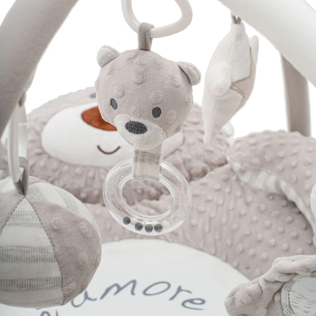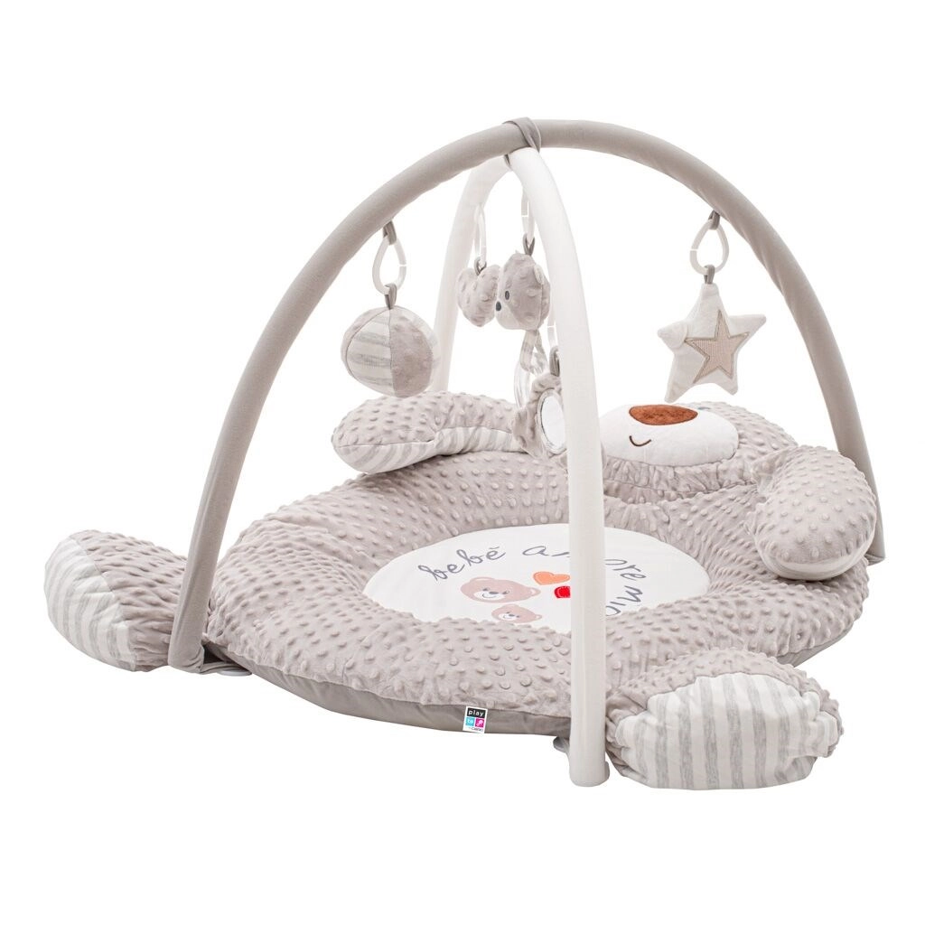 Ce tapis d’éveil de luxe en tissu minky doux à reliefs crée un environnement douillet et sécurisé pour votre bébé. Les contrastes, textures variées et éléments interactifs favorisent le développement de la vue, du toucher, de la coordination et de la motricité fine. Le portique intégré avec jouets amovibles motive l’enfant à s’étirer, saisir et se retourner.
