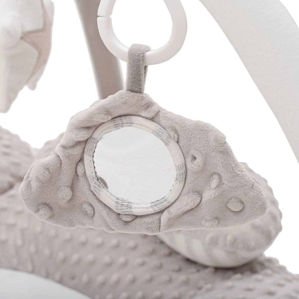 Miroir, éléments bruissants, pouet, anneau de dentition souple, grelot et jouet musical favorisent la coordination œil-main et le développement de la motricité fine.