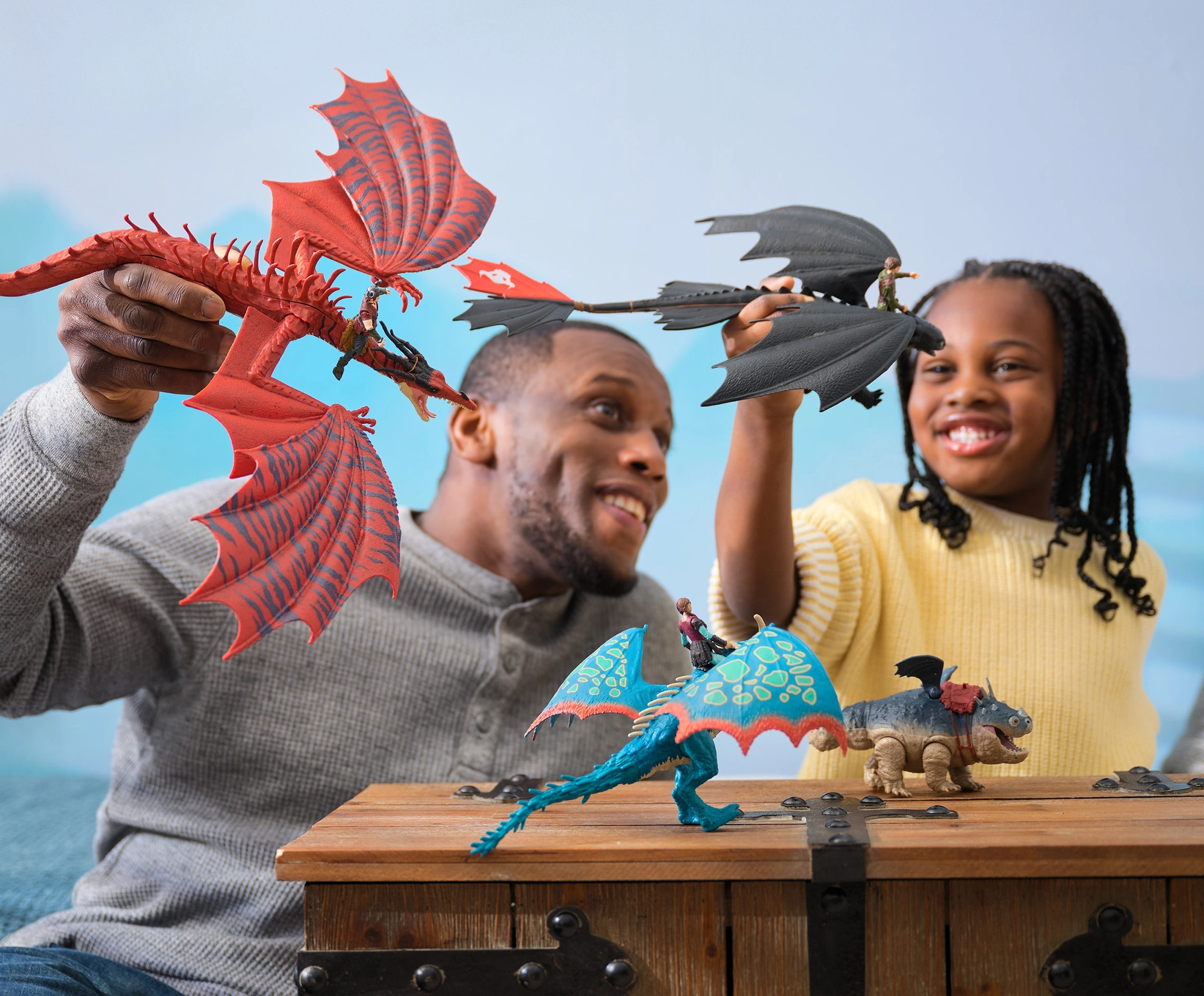 Les figurines Harold (Hiccup), Astrid et Varek (Snotlout) d’environ 7,5 cm se clipsent facilement sur les selles des dragons grâce à des verrous solides pour une assise stable.