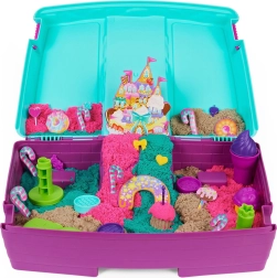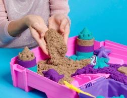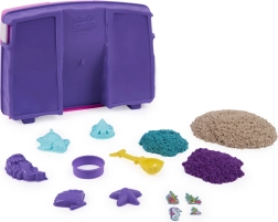 La texture unique du Kinetic Sand fait que les grains s’attirent, de sorte que la matière ne se disperse pas dans la pièce et que les modèles conservent des bords nets. Les enfants créent facilement châteaux, tours, coquilles, étoiles de mer, petites tortues et sirènes. Le set convient à partir de 3 ans.