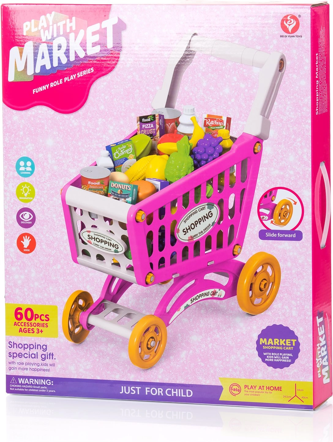 Léger chariot en plastique avec poignée ergonomique et roues pivotantes, idéal pour les petites mains. Le panier ouvert accueille facilement toutes les emplettes des enfants.