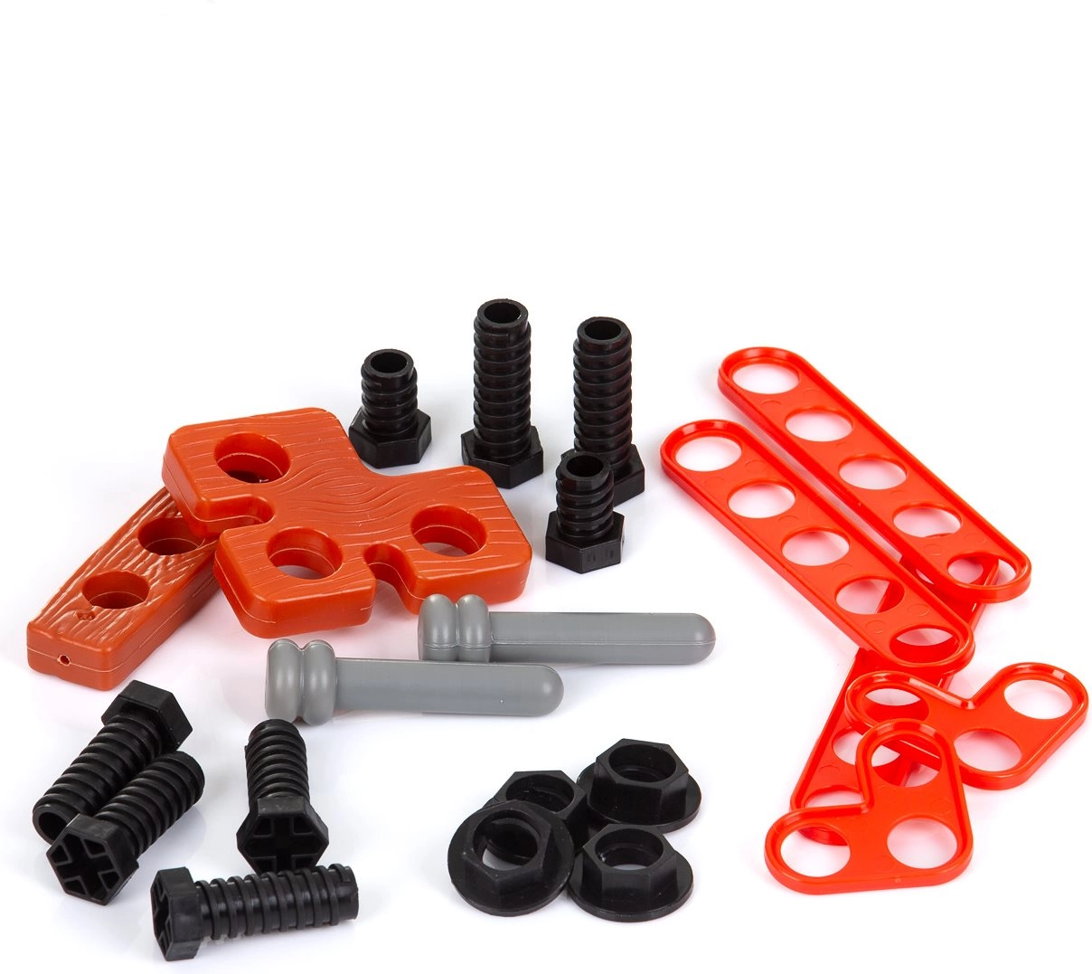 Plateau supérieur avec trous et compartiments pratiques pour garder toutes les pièces bien ordonnées. Idéal pour de petits projets et l’apprentissage de l’ordre.