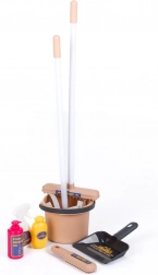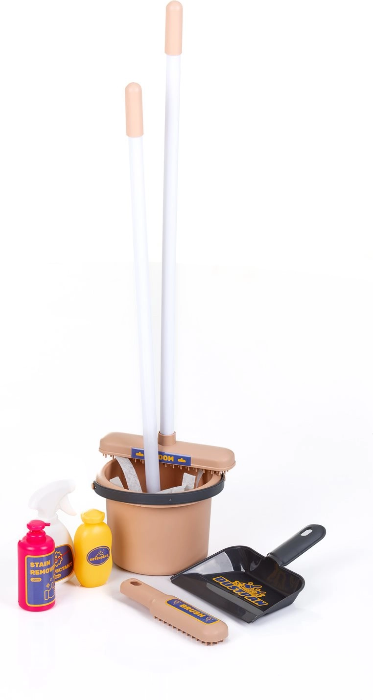 - Accessoires complets : seau avec essoreur, balai/mop, balayette et pelle, brosse, pulvérisateurs et flacons pour « produits de nettoyage ».