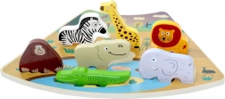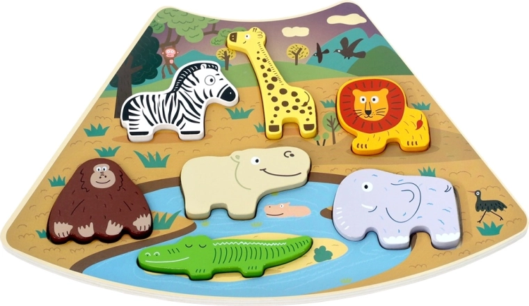 Le puzzle en bois Safari est un jouet idéal pour les premières expériences d’encastrement. Les figurines d’animaux colorées et adorables – zèbre, girafe, lion, gorille/orang-outan, hippopotame, éléphant et crocodile – ont des formes épaisses et faciles à saisir qui facilitent la manipulation. La base illustrant une scène de savane aide à la perception spatiale et à la reconnaissance des formes, car chaque pièce a son emplacement précis.