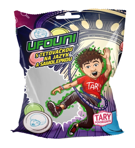 Tary UFO est une sucette ludique qui séduit par son goût et son effet. Après l’avoir léchée, un tatouage temporaire apparaît sur la langue pour une dose immédiate de fun. Le pack contient en plus un autocollant 40×40 mm – parfait pour le cahier, le téléphone ou le skateboard.