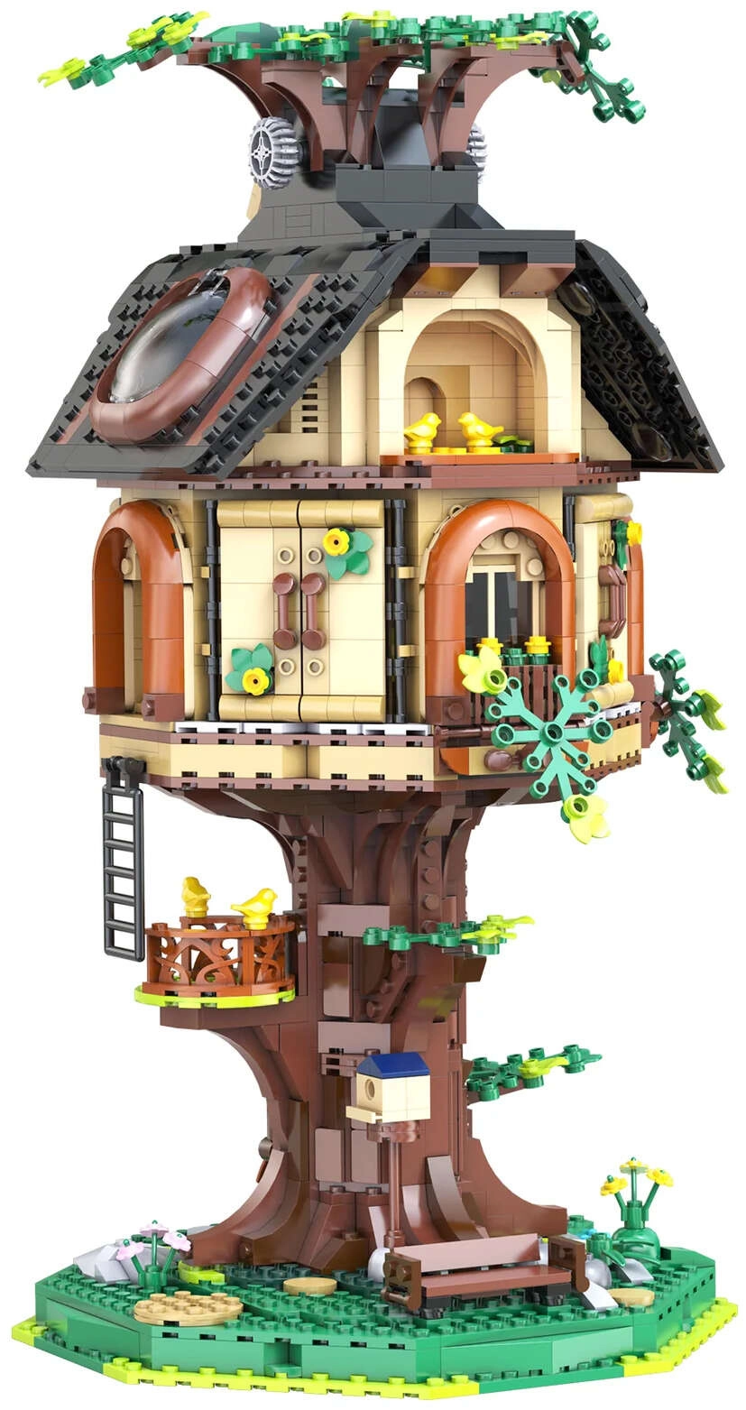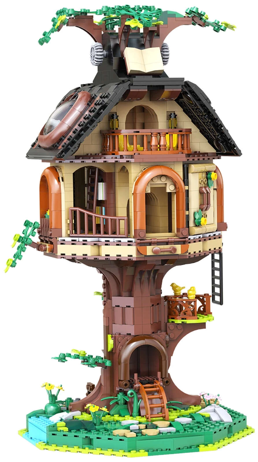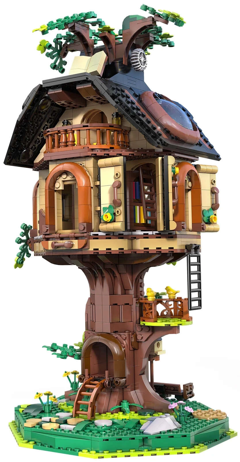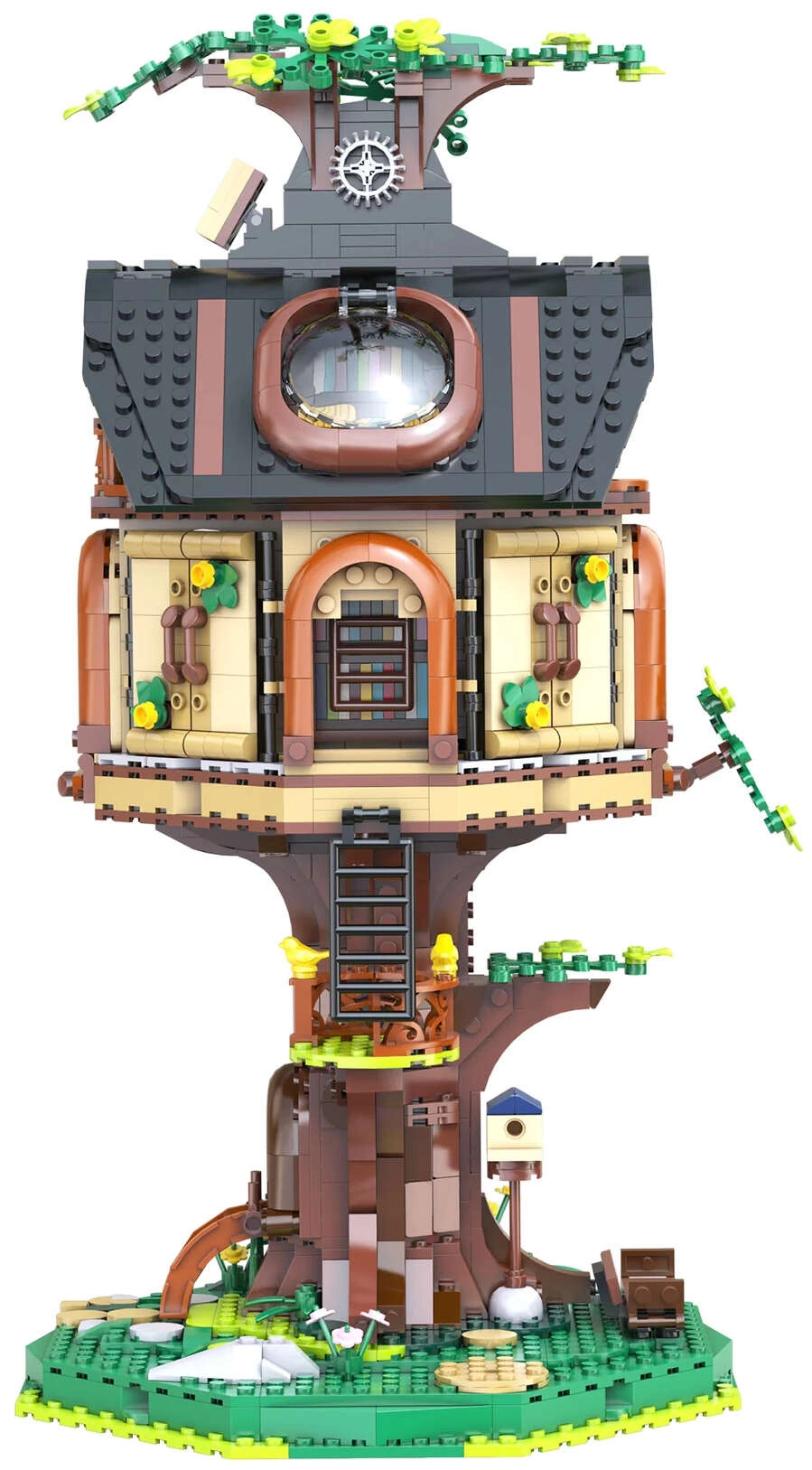 Assemblez une bibliothèque dans une cabane dans l’arbre unique avec une organisation sur deux niveaux : au rez-de-chaussée, une bibliothèque avec étagères, fenêtres et échelles ; à l’étage, une salle de lecture avec télescope confortable. L’arbre se dresse dans une clairière pittoresque avec fleurs et nichoir, avec toit ouvrant et balcon pour observer les oiseaux.