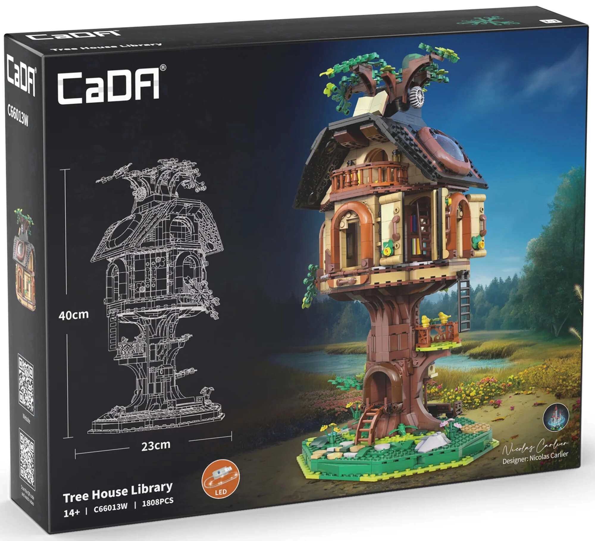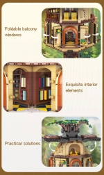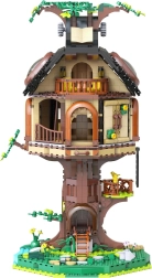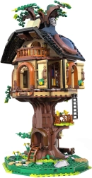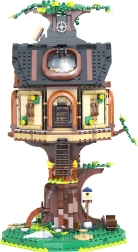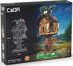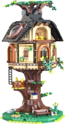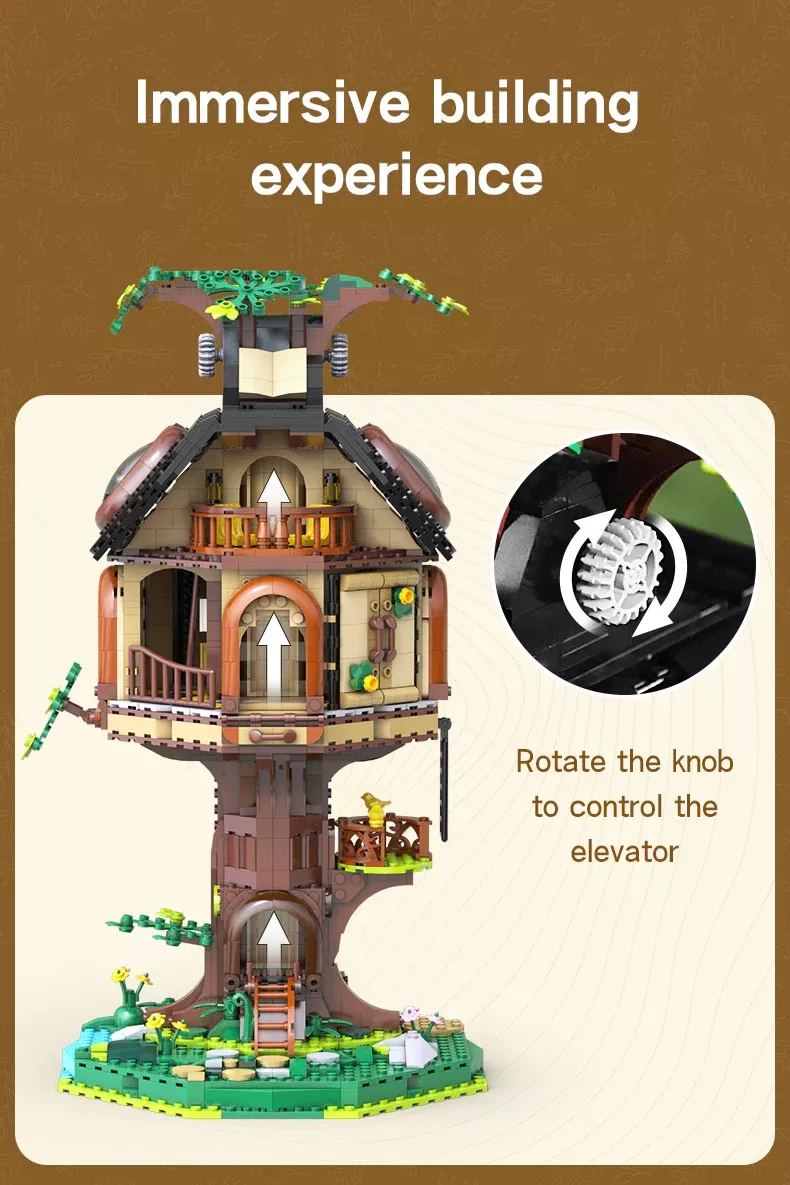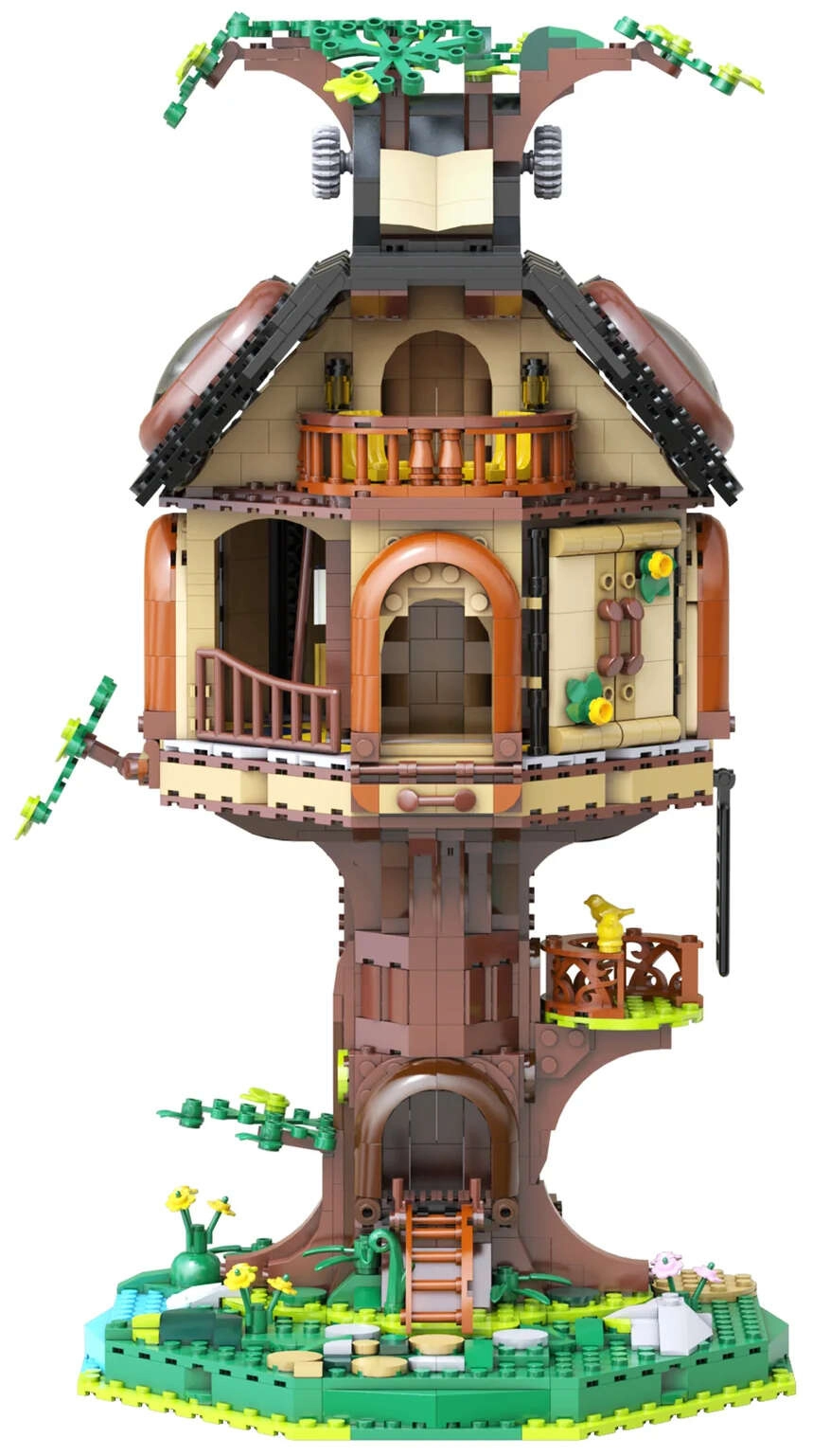 Assemblez une bibliothèque dans une cabane dans l’arbre unique avec une organisation sur deux niveaux : au rez-de-chaussée, une bibliothèque avec étagères, fenêtres et échelles ; à l’étage, une salle de lecture avec télescope confortable. L’arbre se dresse dans une clairière pittoresque avec fleurs et nichoir, avec toit ouvrant et balcon pour observer les oiseaux.