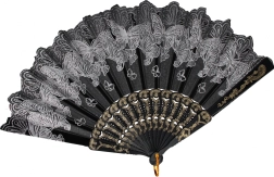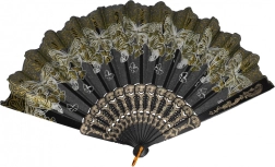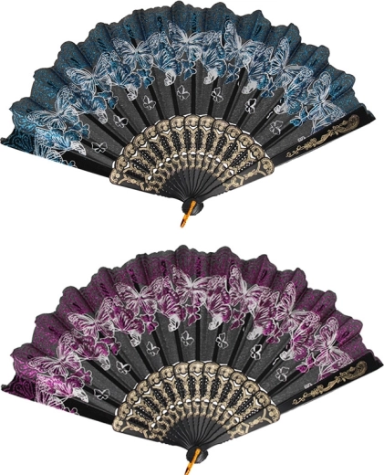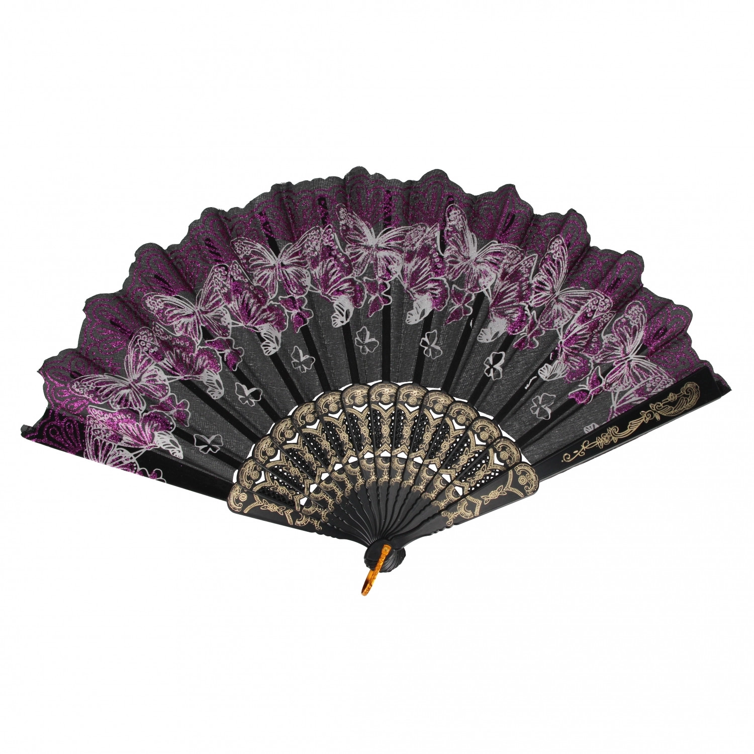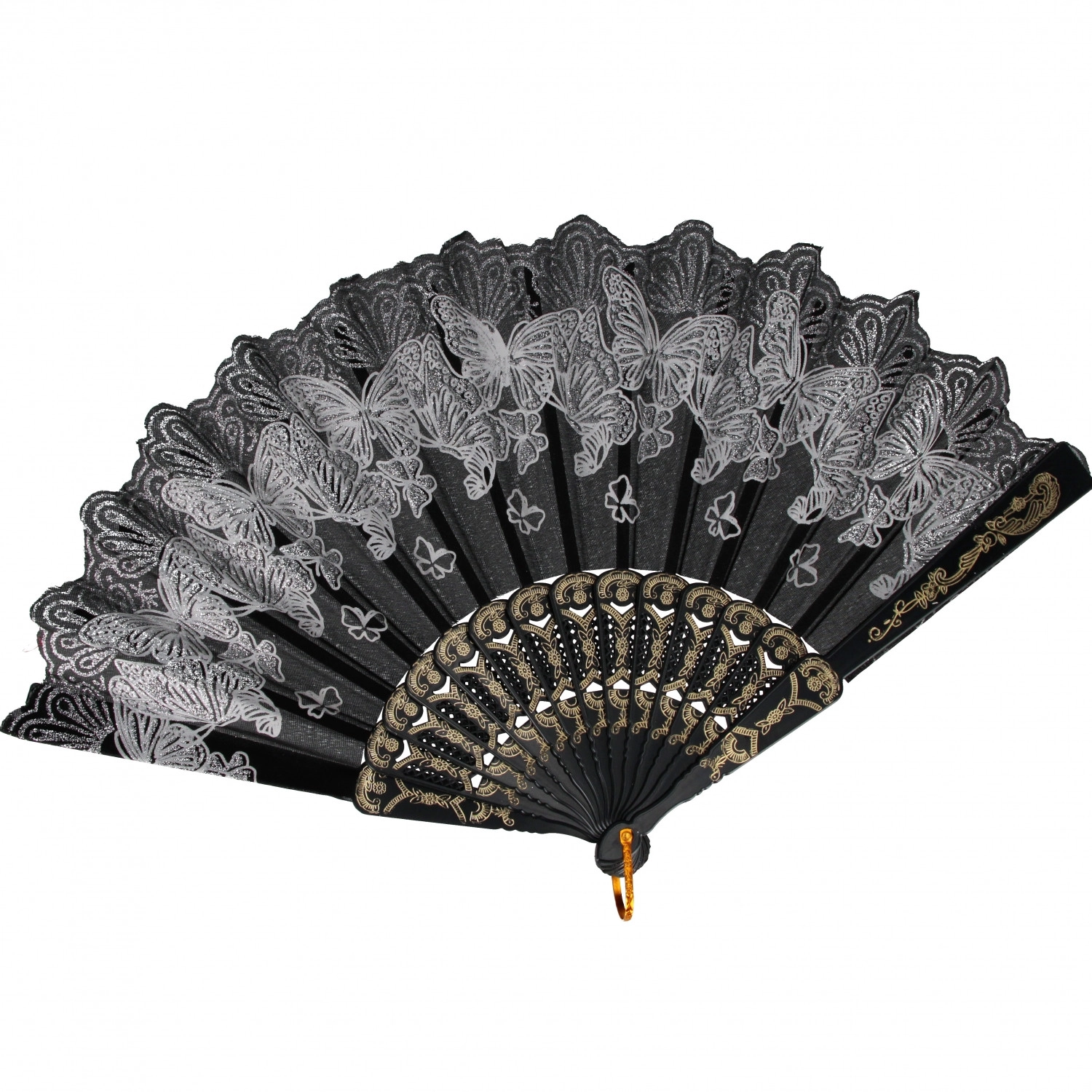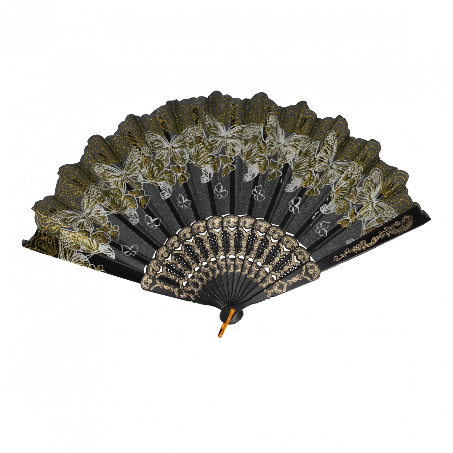Une impression décorative avec des papillons, une « dentelle » délicate sur les bords et des accents dorés confèrent à l’éventail un aspect festif, idéal pour toutes les occasions.