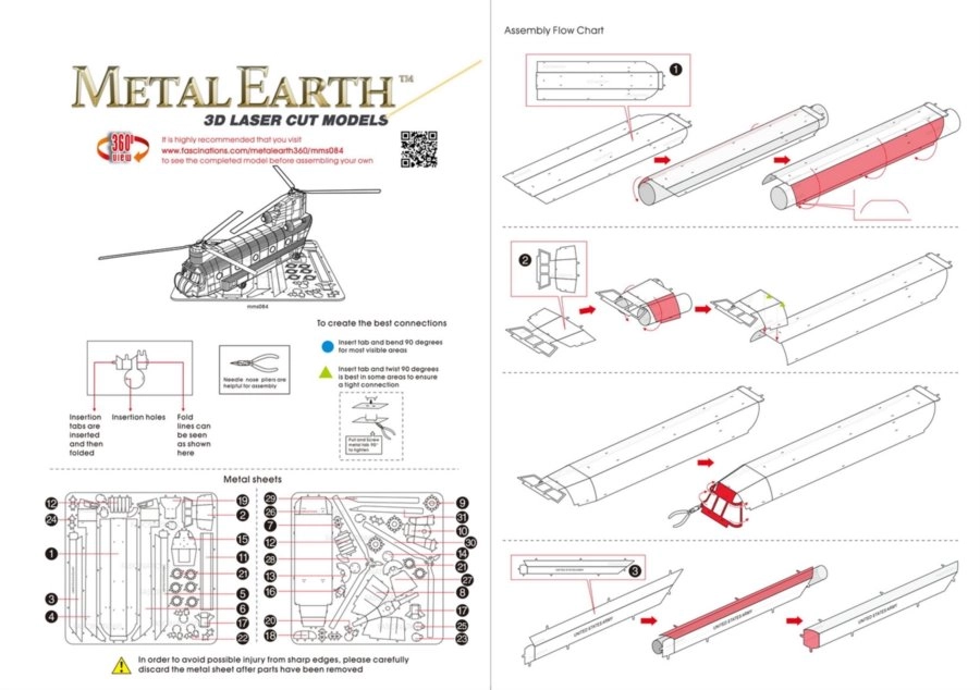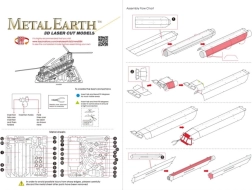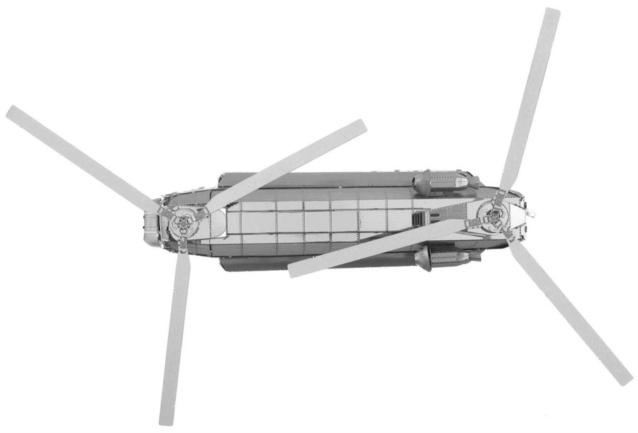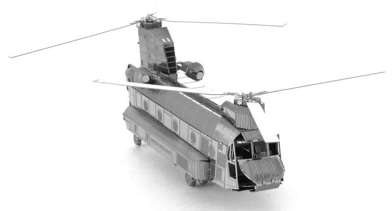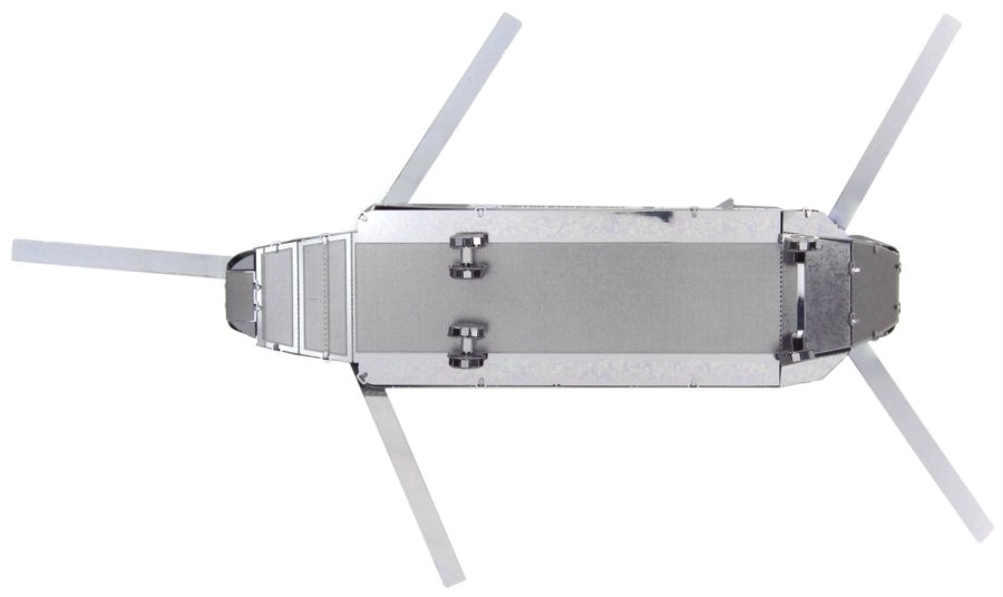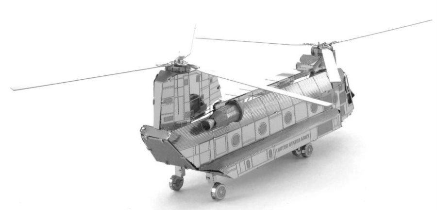 Le modèle de la gamme METAL EARTH est composé de feuilles d’acier 11 × 11 cm aux pièces finement découpées. Grâce à la gravure laser, la surface offre des détails réalistes, des lignes de panneaux aux fenêtres de la cabine, jusqu’aux rotors en tandem typiques du CH-47 CHINOOK.