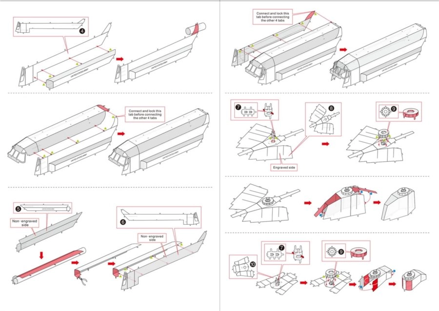 Les pièces s’assemblent grâce à des loquets et des languettes pliées. Une petite pince et une pince coupante sont recommandées (non incluses).
