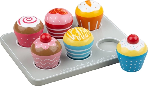 Six muffins en bois joyeux sur un plateau pour jouer à la dinette, à la boutique ou au goûter. Chaque muffin est coloré et décoré, se place facilement dans un support en bois et stimule l’imagination des enfants, la motricité fine et les compétences sociales. Fabriqué en bois de qualité, issu de sources responsables et conforme aux normes de sécurité européennes en vigueur.