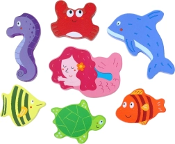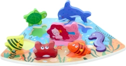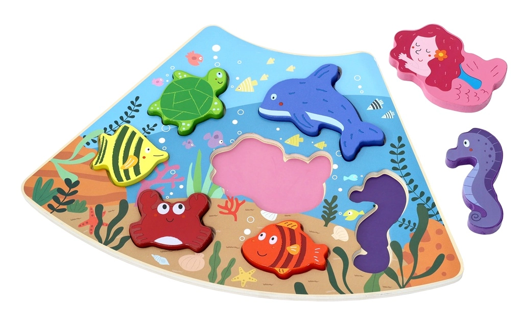 Découvrez la magie de l’océan avec une base en bois robuste et 7 pièces différentes – tortue, dauphin, sirène, hippocampe, crabe et d’autres poissons. Grâce aux pièces épaisses et lisses, le puzzle tient parfaitement même entre les plus petites mains et aide à entraîner la perception des formes et la patience.