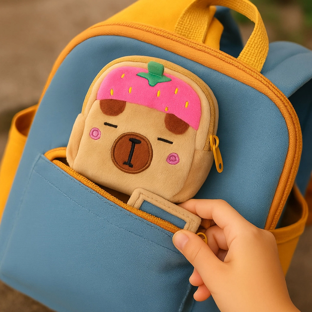 La matière peluche et le motif capybara avec fraise rose ajoutent une touche de mignonnerie kawaii à chaque journée – idéal pour les enfants et les âmes joueuses.